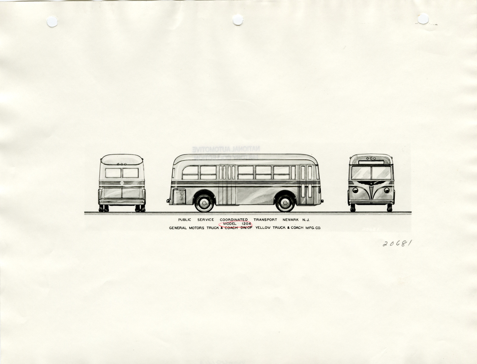 Artist's depiction, rear, side and front views of a Yellow Truck and Coach bus for the Public Service Coordinated Transport, Newark, New Jersey. Printed on front: Public Service Coordinated Transport, Newark, N.J. Model 1204. General Motors Truck & Coach, Div. of Yellow Truck & Coach Mfg. Co."