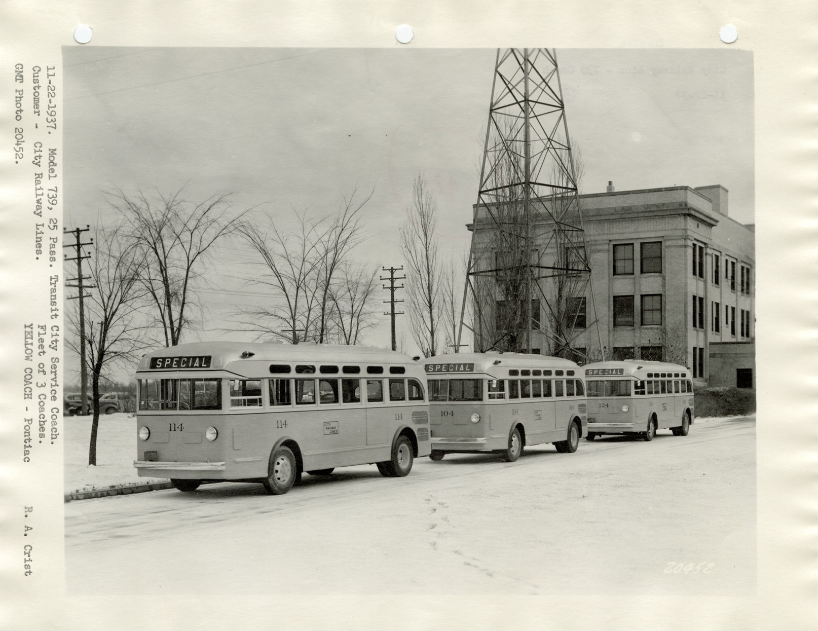 View of three Yellow Truck and Coach buses for the City Railway Lines. Typed on front: "11-22-37. Model 739, 25 pass. Transit city service coach. Customer, City Railway Lines. Fleet of 3 coaches. GMT photo 20452. Yellow Coach, Pontiac. R.A. Crist." Typed on back: "City Railway Lines, 739 coach, 11-22-37."