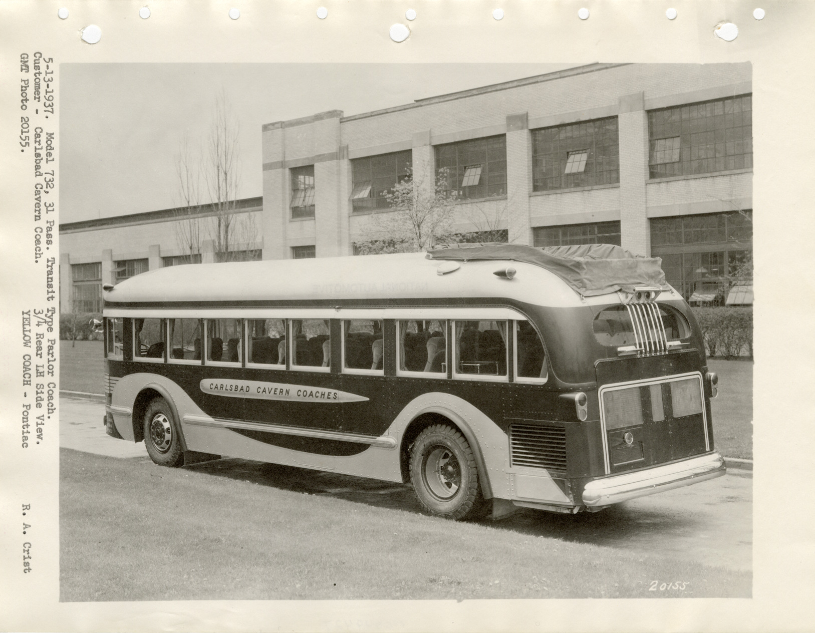 View of a Yellow Truck and Coach bus for the Carlsbad Cavern Coaches. Typed on front: "5-13-37. Model 732, 31 pass. Transit type parlor coach. Customer, Carlsbad Cavern Coach. 3/4 rear LH side view. GMT photo 20155. Yellow Coach, Pontiac. R.A. Crist."