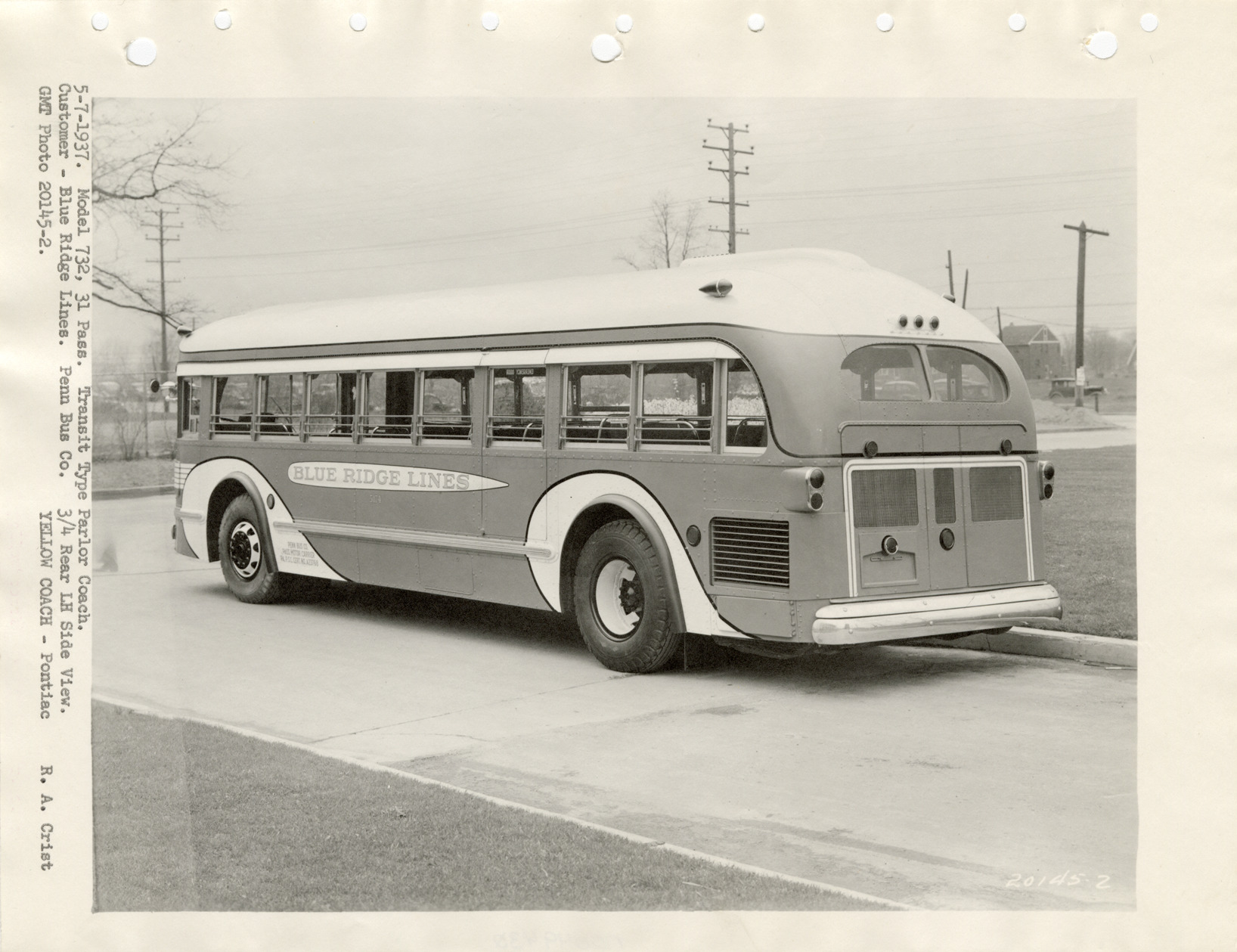 View of a Yellow Truck and Coach bus for the Blue Ridge Lines. Typed on front: "5-7-1937. Model 732, 31 pass. Transit type parlor coach. Customer, Blue Ridge Lines, Penn Bus Co. 3/4 rear LH side view. GMT photo 20145-2. Yellow Coach, Pontiac. R.A. Crist."