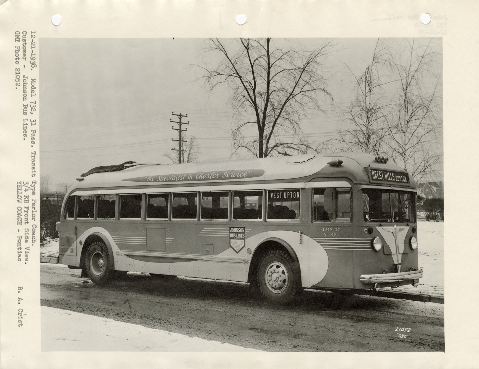 View of a Yellow Truck and Coach bus for the Johnson Bus Lines. Typed on front: "12-21-1938. Model 732, 31 pass. Transit type parlor coach. Customer, Johnson Bus Lines. 3/4 RH front side view. GMT photo 21052. Yellow Coach, Pontiac. R.A. Crist." Typed on back: "Johnson Bus Lines, 732 coach, 12-21-38."