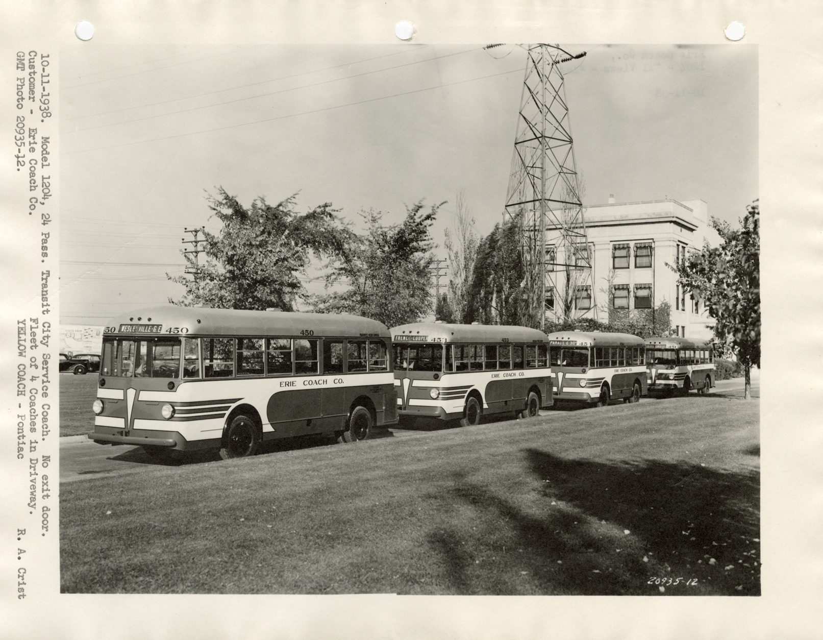 View of four Yellow Truck and Coach buses for the Erie Coach Co. Typed on front: "10-11-1938. Model 1204, 24 pass. Transit city service coach. Customer, Erie Coach Co. Fleet of 4 coaches in driveway. GMT photo 20935-12. Yellow Coach, Pontiac. R.A. Crist." Typed on back: "Erie Coach Co., 1204, all views, fleet, 10-11-38."