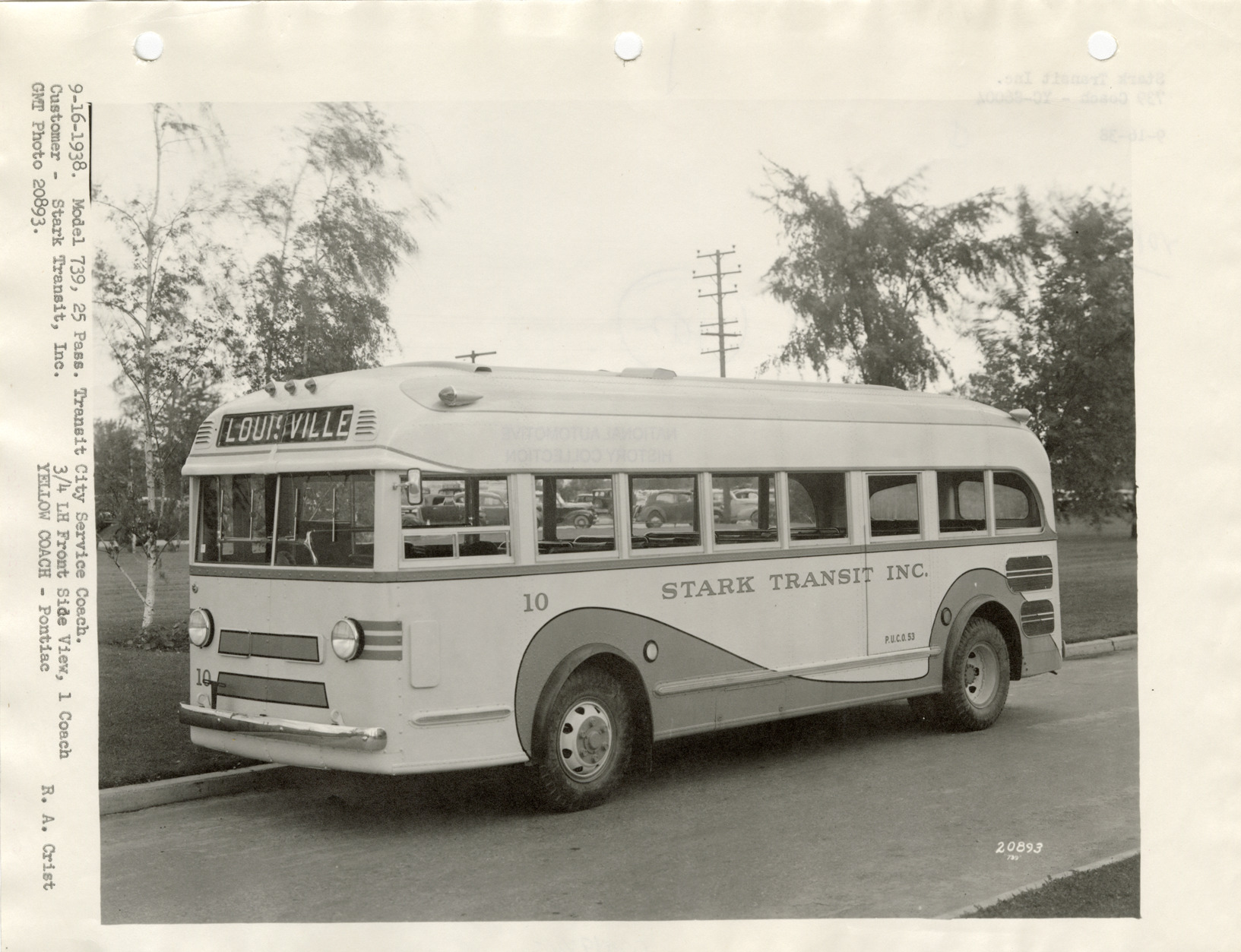 View of a Yellow Truck and Coach bus for Stark Transit. Typed on front: "9-16-1938. Model 739, 25 pass. Transit city service coach. Customer, Stark Transit, Inc. 3/4 LH front side view, 1 coach. GMT photo 20893. Yellow Coach, Pontiac. R.A. Crist." Typed on back: "Stark Transit, Inc. 739 coach, YC-86004, 9-16-38."