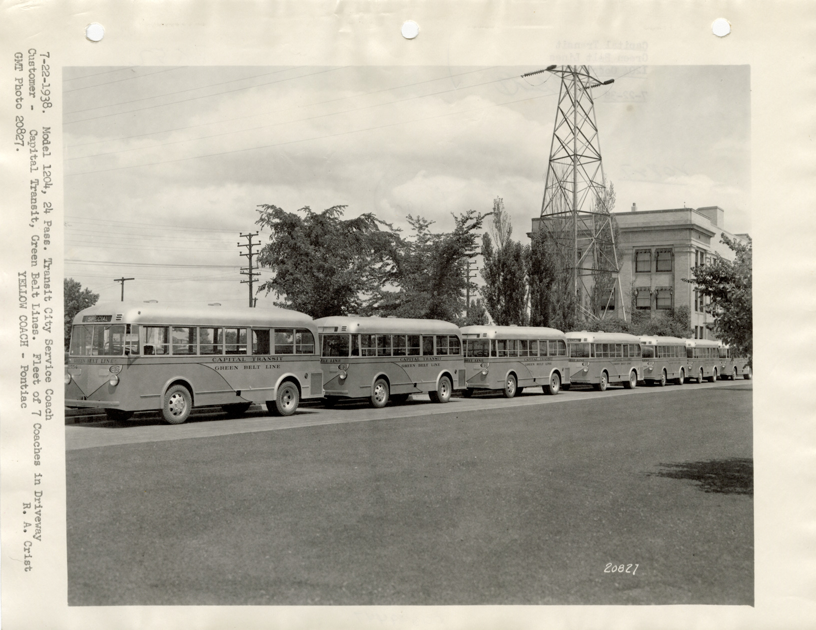 View of seven Yellow Truck and Coach buses for the Capital Transit, Green Belt Line. Typed on front: "7-22-1938. Model 1204, 25 pass. Transit city service coach. Customer, Capital Transit, Green Belt Line. Fleet of 7 coaches in driveway. GMT photo 20827. Yellow Coach, Pontiac. R.A. Crist." Typed on back: "Capital Transit, Green Belt Lines, 1204 coach, 7-22-38."