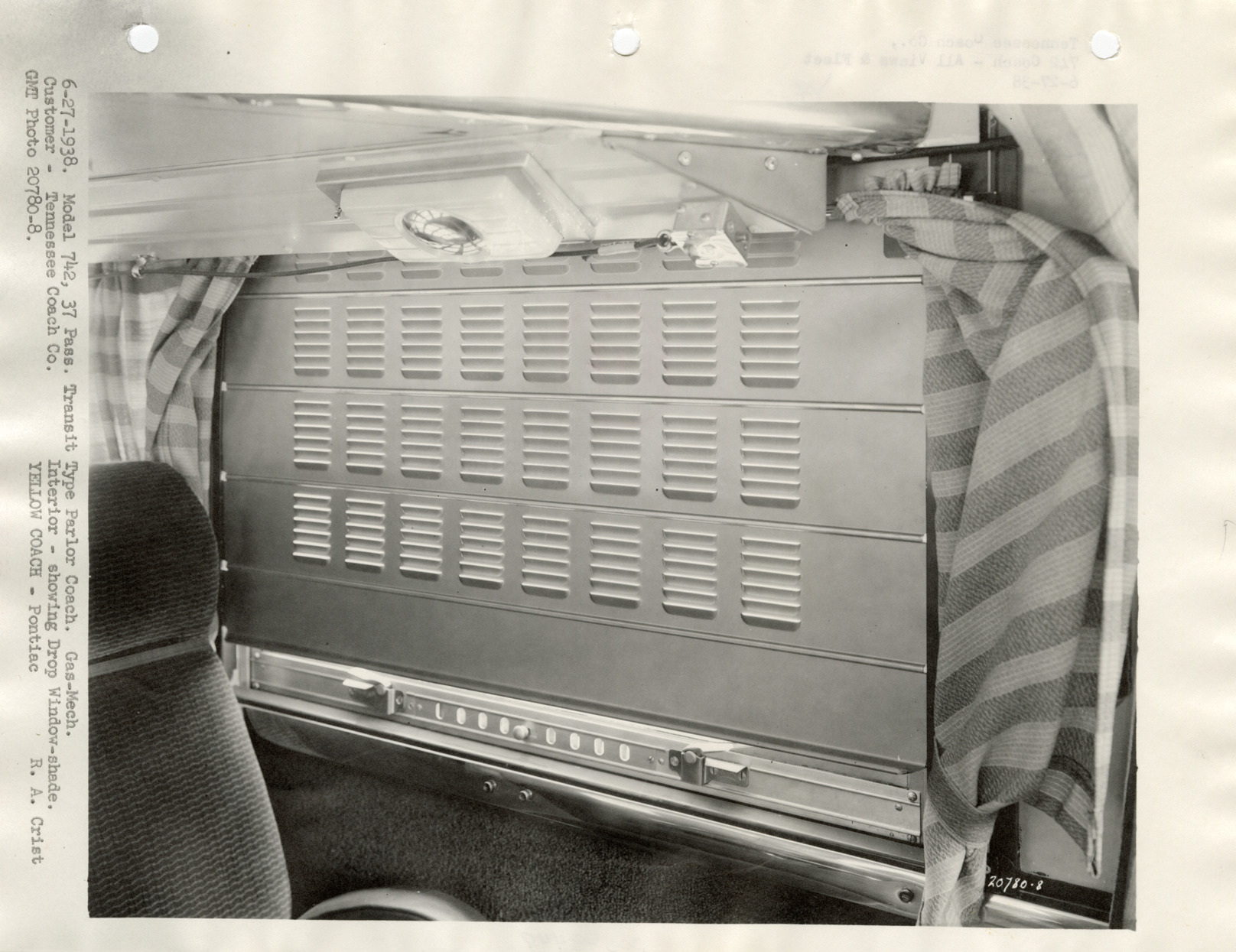 Close-up view of a window shade in a Yellow Truck and Coach bus for the Tennessee Coach Co. Typed on front: "6-27-1938. Model 742, 37 pass. Transit type parlor coach. Gas-Mech. Customer, Tennessee Coach Co. Interior, showing drop window-shade. GMT photo 20780-8. Yellow Coach, Pontiac. R.A. Crist." Typed on back: "Tennessee Coach Co., 742 coach, all views & fleet, 6-27-38."