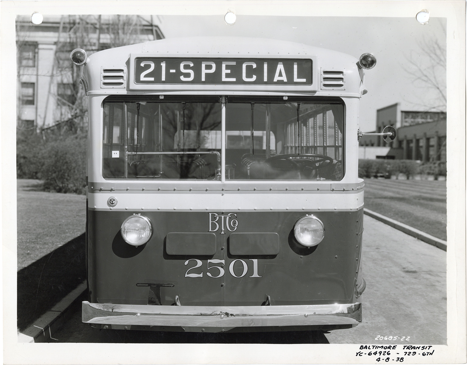 Front view of a Yellow Truck and Coach trolley bus, Model 729, for the Baltimore Transit Company. Handwritten on front: "Baltimore Transit, YC-64926, 729, 6th, 4-8-38." Handwritten on back: "Yellow Truck & Coach. Model 729 trolley."