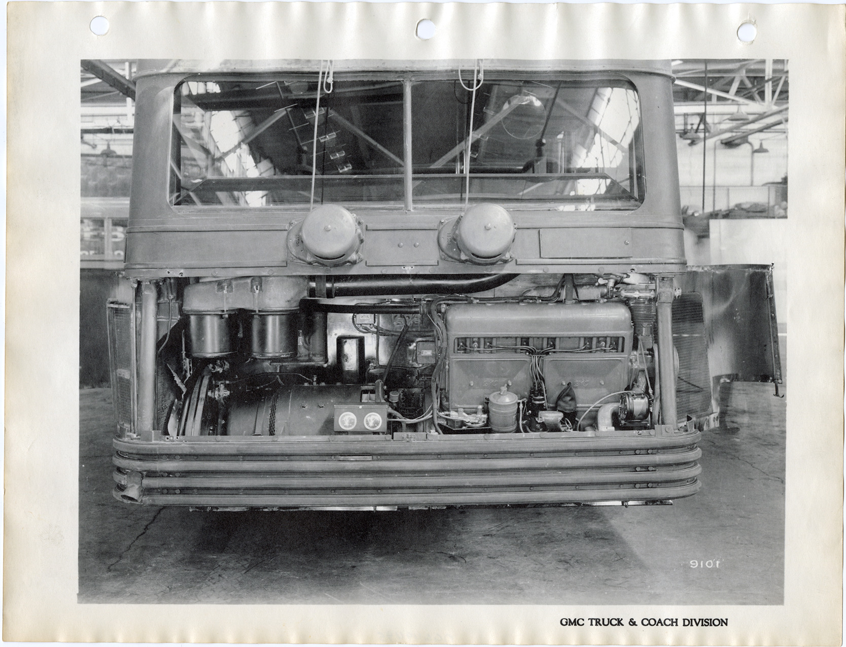 Close-up view of the motor for a Yellow Truck and Coach trolley bus, Model 729. Printed on front: "GMC Truck & Coach Division." Handwritten on front: "Model 729." Handwritten on back: "Yellow Truck & Coach. Model 729 trolley."