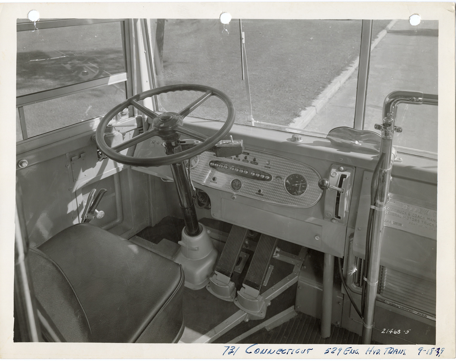 Favorite this☆ Interior, Yellow Truck and Coach bus, Model 731 Description: Interior view of a Yellow Truck and Coach bus, Model 731, showing driver's seat, instrument panel and steering wheel. Handwritten on front: "731 Connecticut, 529 eng., hyd. trans., 9-18-39." Handwritten on back: "Yellow Truck & Coach. Model 731." Details Resource ID: na049502 Subject: Buses--Interiors Buses--Seats Buses--Instrument panels Yellow Truck and Coach Manufacturing Company General Motors Truck Company Photographic prints Date Issued: 1939-09-18 Format: 1 photographic print ; 8 x 10 in. Member of: National Automotive History Collection Filing Location: MS121/VanDegrift, Thomas, 17:5 Rights: Physical rights are retained by DPL. Copyright is retained in accordance with U.S. copyright laws.