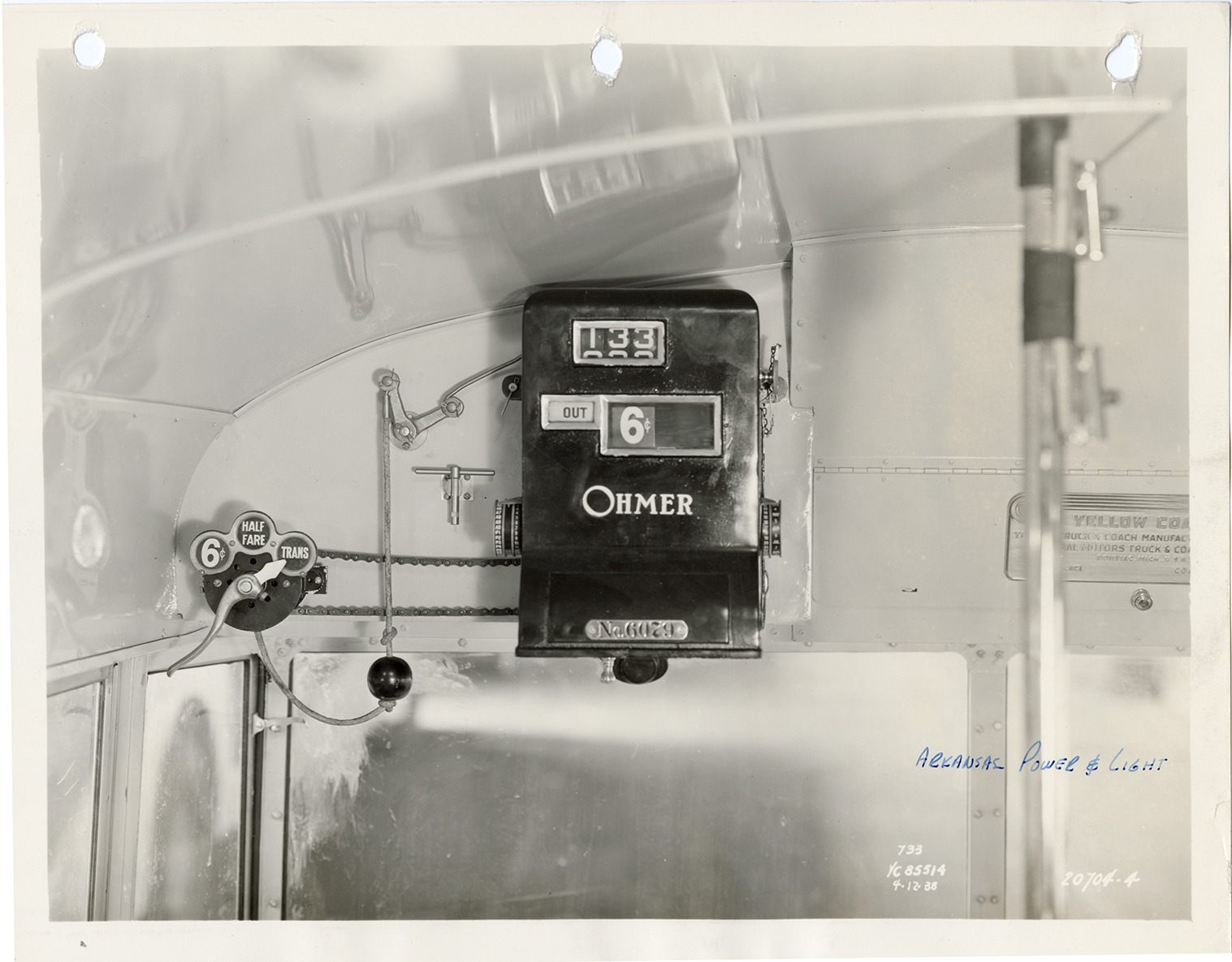 View of an Ohmer fare box in a Yellow Truck and Coach bus, Model 733. Printed on front: "733, YC-85514, 4-12-38." Handwritten on front: "Arkansas Power & Light." Handwritten on back: "Yellow Truck & Coach. Model 733."