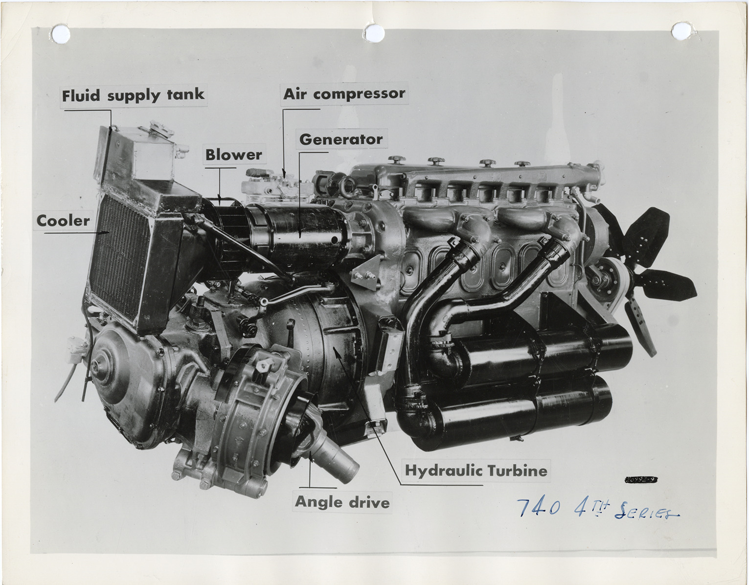 View of the engine of a Yellow Truck and Coach bus, Model 740. Labels indicate fluid supply tank, air compressor, cooler, blower, generator, angle drive and hydraulic turbine. Handwritten on front: "740, 4th series." Handwritten on back: "Yellow Truck & Coach. Model 740."