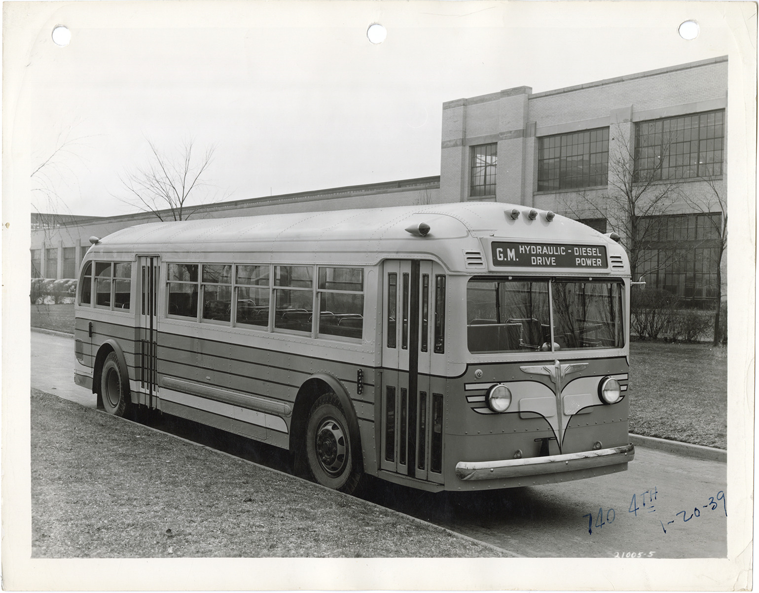 View of a Yellow Truck and Coach bus, Model 740. Handwritten on front: "740, 4th, 1-20-39." Handwritten on back: "Yellow Truck & Coach. Model 740."