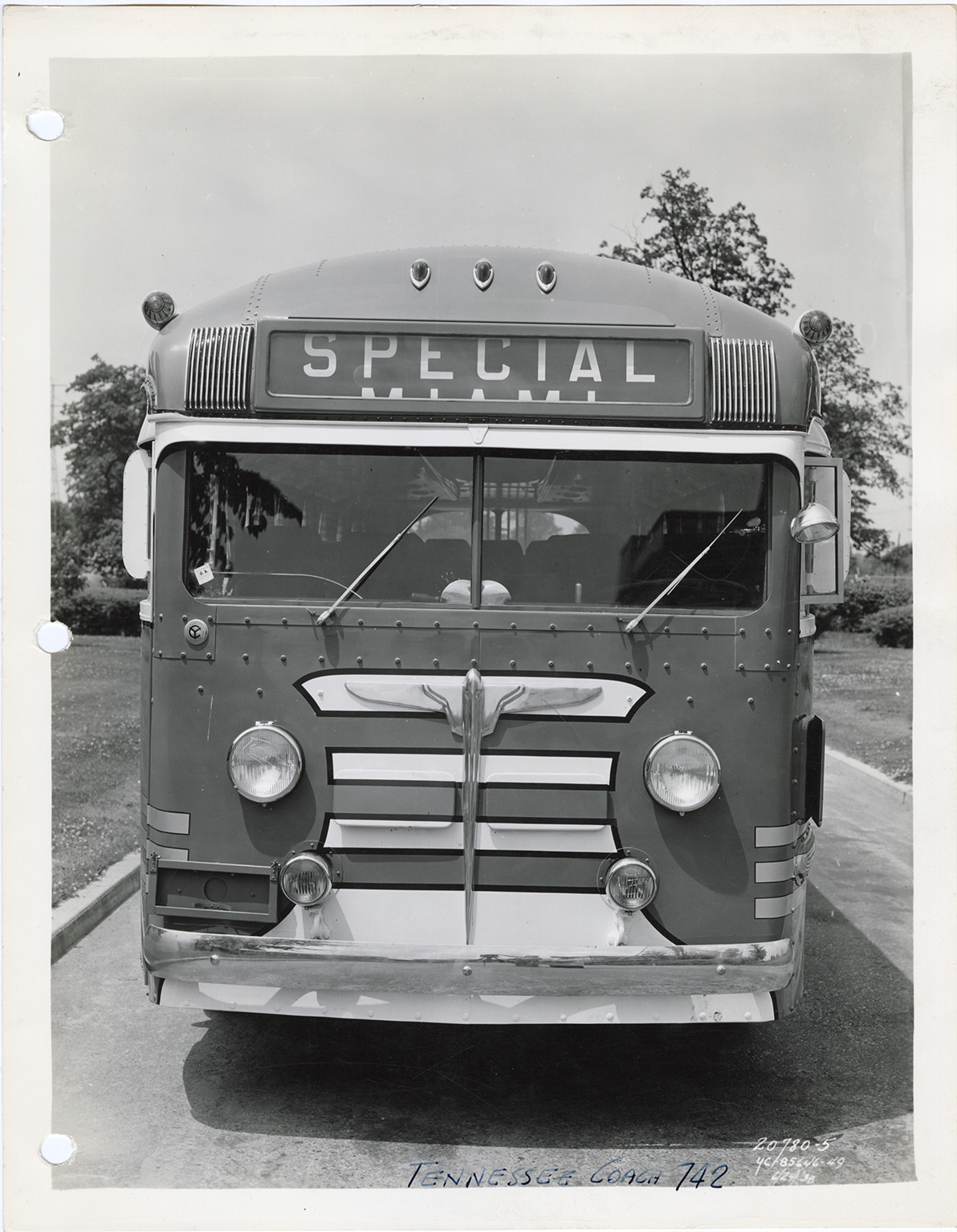 Front view of a Yellow Truck and Coach bus, Model 742, for the Tennessee Coach Lines. Printed on front: "YC-85646-49, 6/24/'38." Handwritten on front: "Tennessee Coach, 742." Handwritten on back: "Yellow Truck & Coach. Model 742."