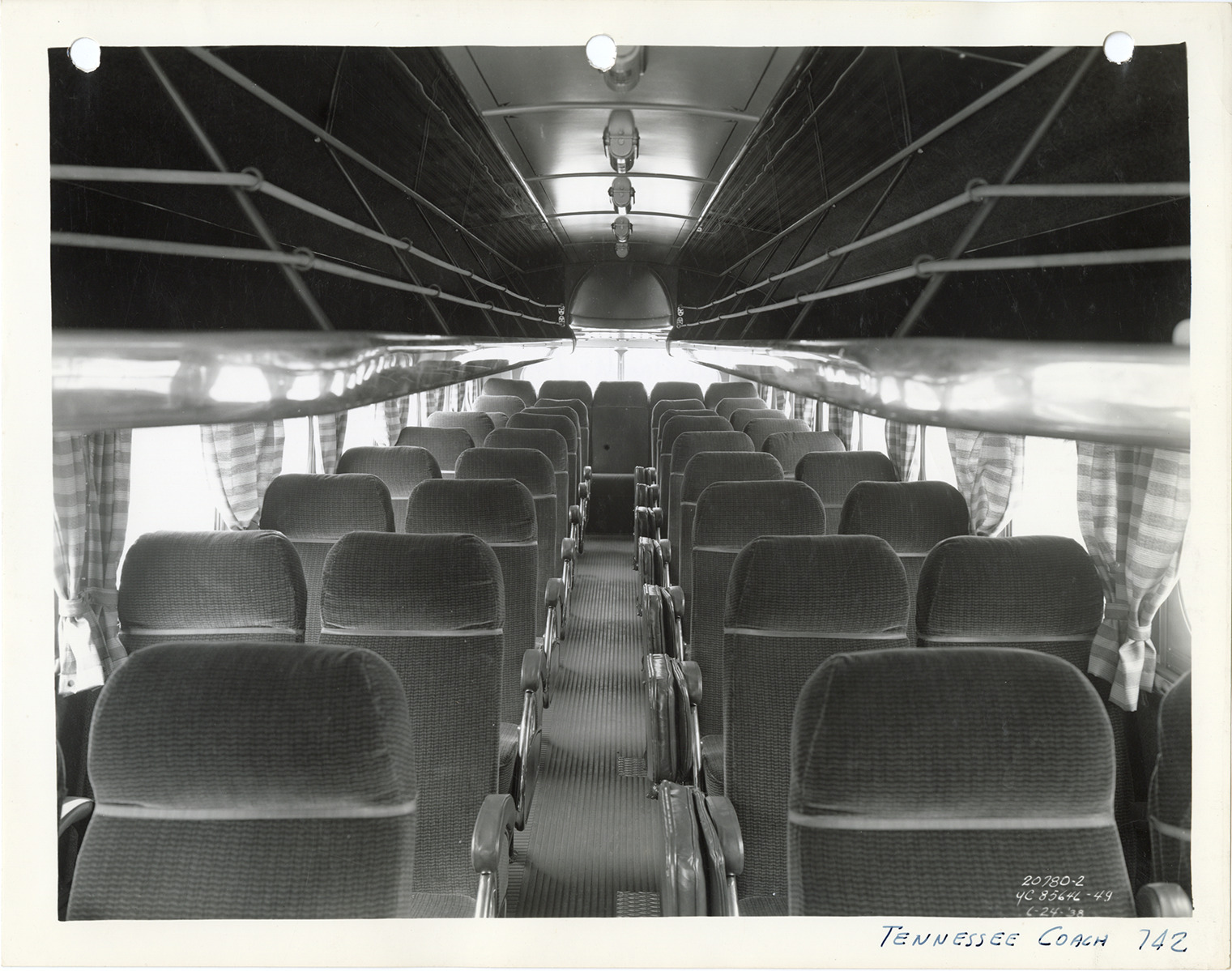 Interior view of a Yellow Truck and Coach bus, Model 742, for the Tennessee Coach Lines, showing seats. Printed on front: "YC-85646-49, 6/24/'38." Handwritten on front: "Tennessee Coach, 742." Handwritten on back: "Yellow Truck & Coach. Model 742."