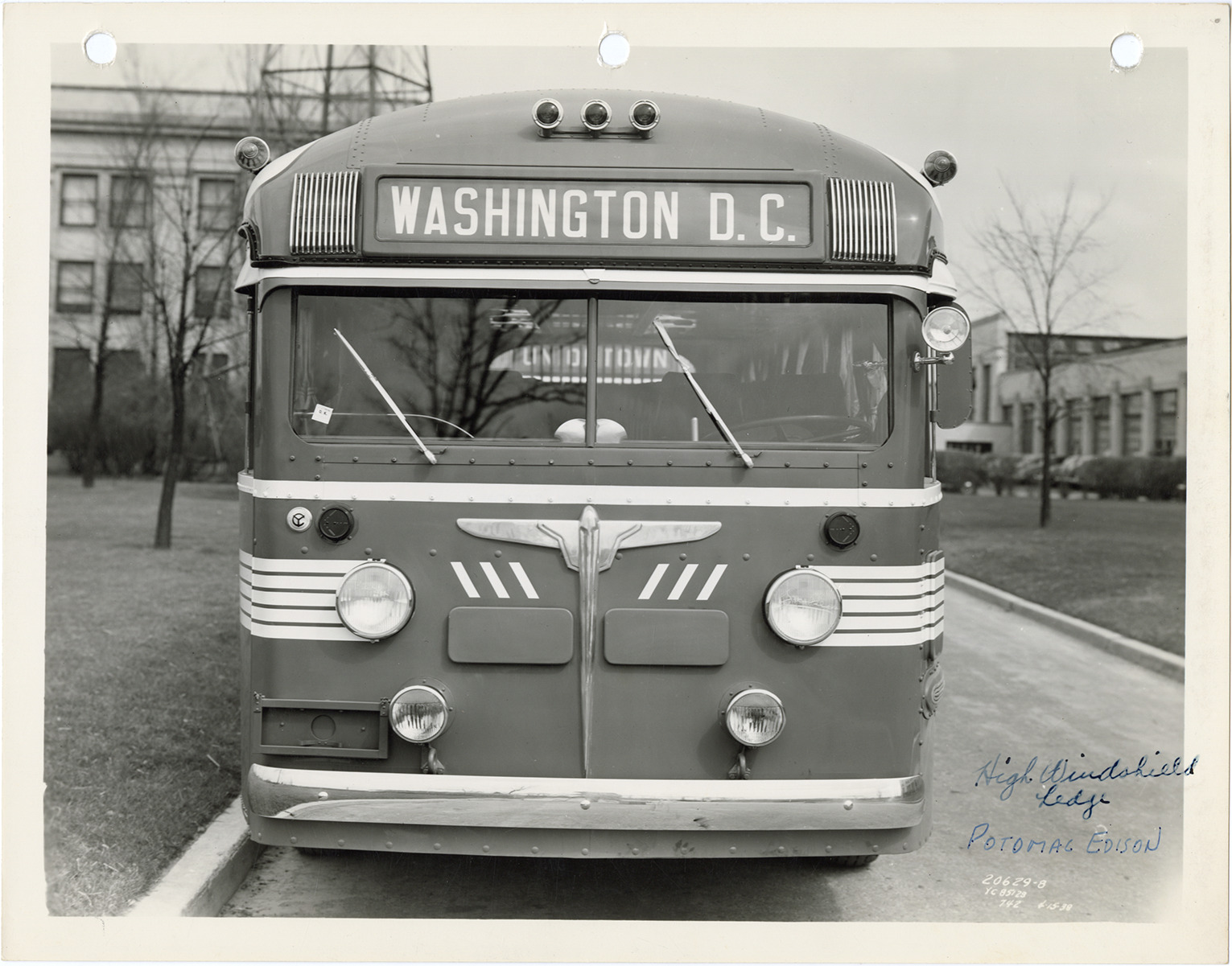 Front view of a Yellow Truck and Coach bus, Model 742, for the Potomac Edison Company. Printed on front: "YC-85128, 742, 4/15/38." Handwritten on front: "High windshield, Potomac Edison." Handwritten on back: "Yellow Truck & Coach. Model 742."