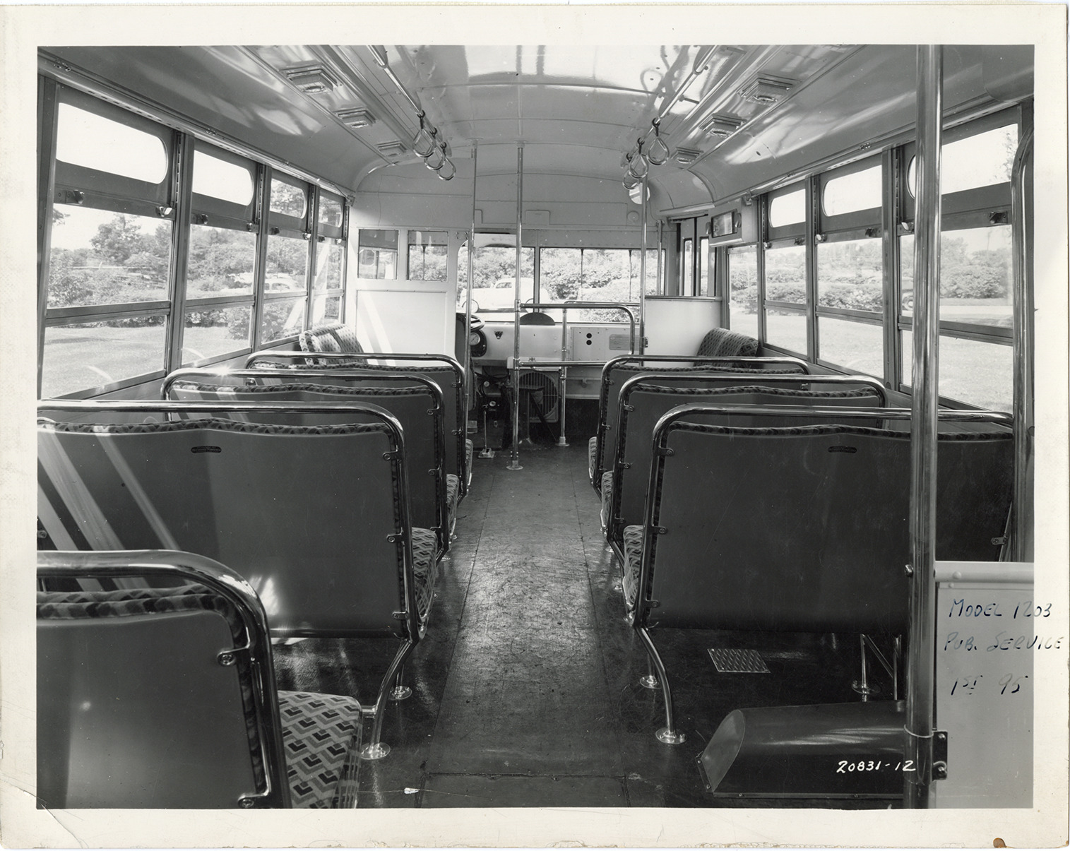 Favorite this☆ Interior, Yellow Truck and Coach bus, Model 1203 Description: Interior view of a Yellow Truck and Coach bus, Model 1203, showing seats. Printed on front: "Coach 1203." Handwritten on front: "Model 1203, pub. service, 1st, 95." Handwritten on back: "Yellow Truck & Coach. Model 1203." Details Resource ID: na049562 Subject: Buses--Interiors Buses--Seats Yellow Truck and Coach Manufacturing Company General Motors Truck Company Photographic prints Date Issued: Unknown year Format: 1 photographic print mounted on fabric ; 8 x 10 in. Member of: National Automotive History Collection Filing Location: MS121/VanDegrift, Thomas, 18:4 Rights: Physical rights are retained by DPL. Copyright is retained in accordance with U.S. copyright laws.