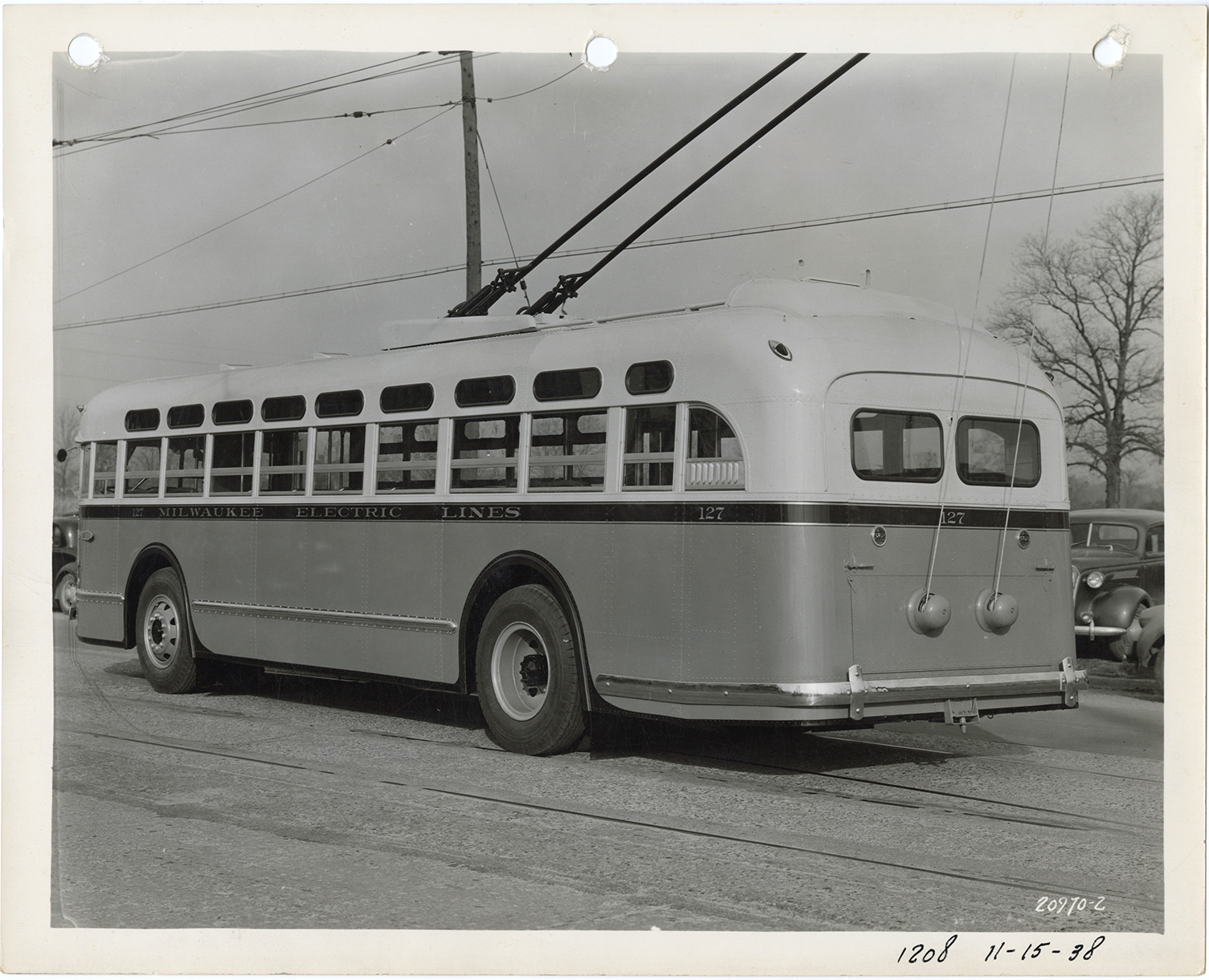 View of a Yellow Truck and Coach trolley bus, Model 1208, for the Milwaukee Electric Lines. Handwritten on front: "1208, 11-15-38." Handwritten on back: "Yellow Truck & Coach. Model 1208 trolley."