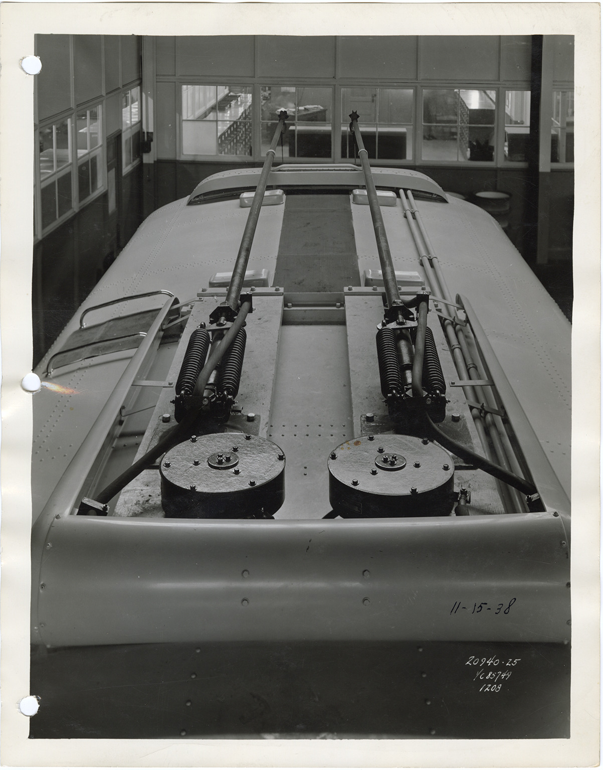 View of the roof of a Yellow Truck and Coach trolley bus, Model 1208. Printed on front: "1208, YC-85749." Handwritten on front: "11-15-38." Handwritten on back: "Yellow Truck & Coach. Model 1208 trolley."