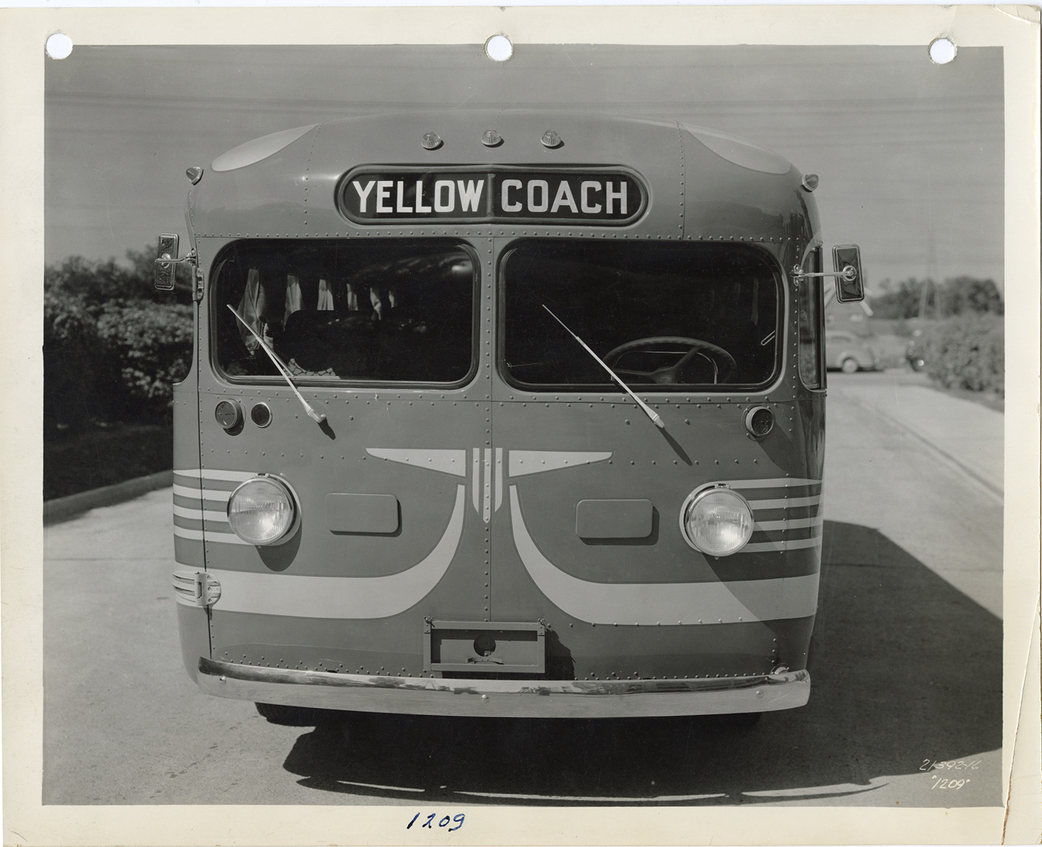 Front view of a Yellow Truck and Coach bus, Model 1209. Handwritten on front: "1209." Handwritten on back: "Yellow Truck & Coach. Model 1209."