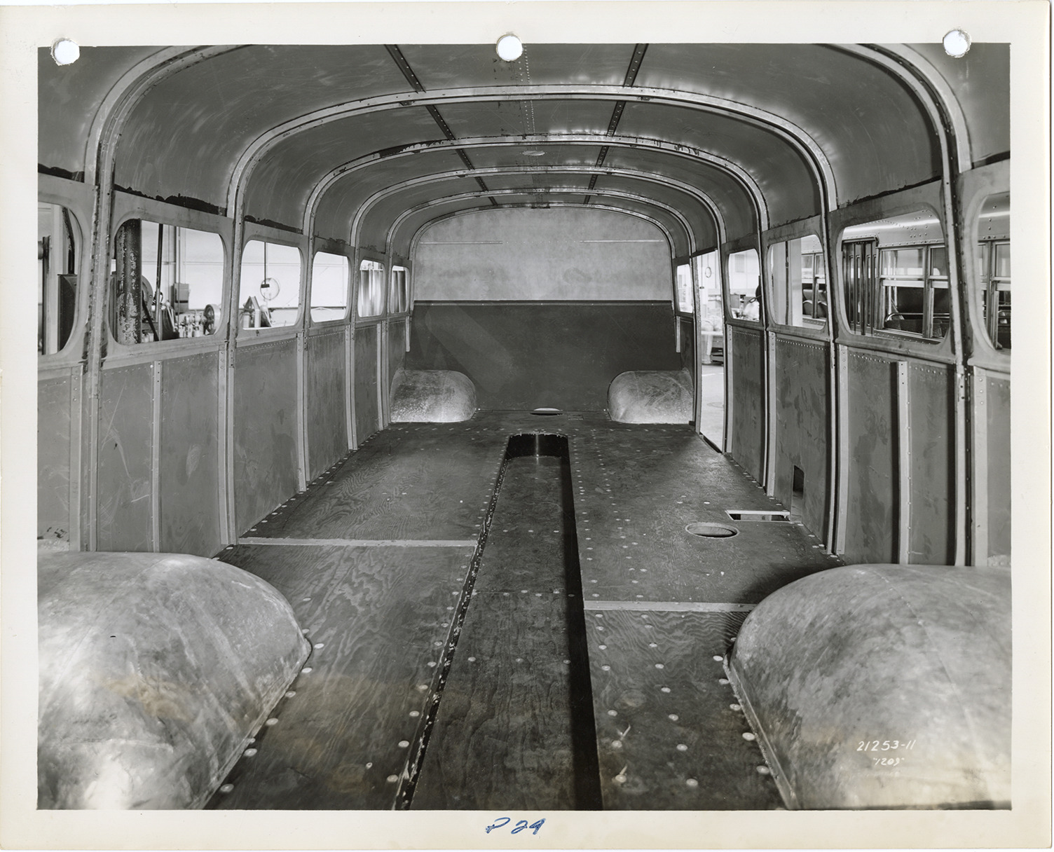 Interior view of a Yellow Truck and Coach bus, Model 1209, under construction in factory. Printed on front: "1209." Handwritten on front: "P29." Handwritten on back: "Yellow Truck & Coach. Model 1209."