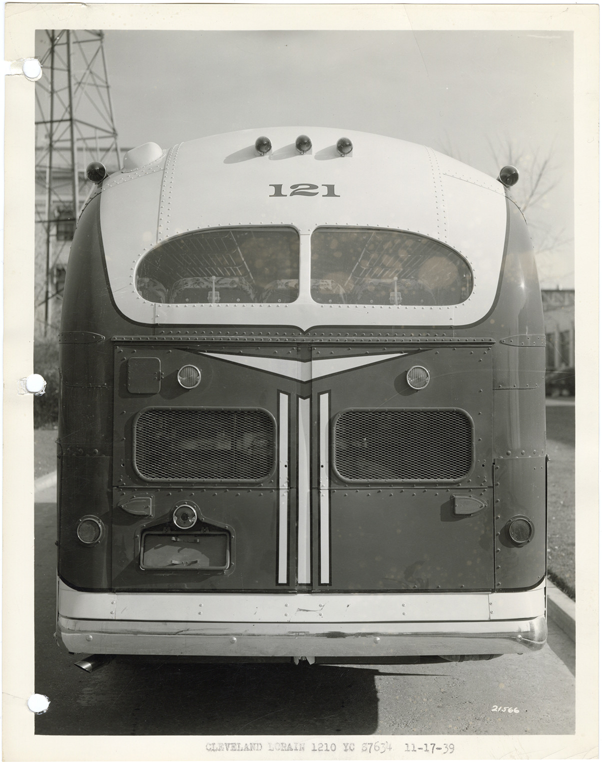 Rear view of a Yellow Truck and Coach bus, Model 1210. Typed on front: "Cleveland Lorain, 1210, YC 87634, 11-17-39." Handwritten on back: "Yellow Truck & Coach. Model 1210."