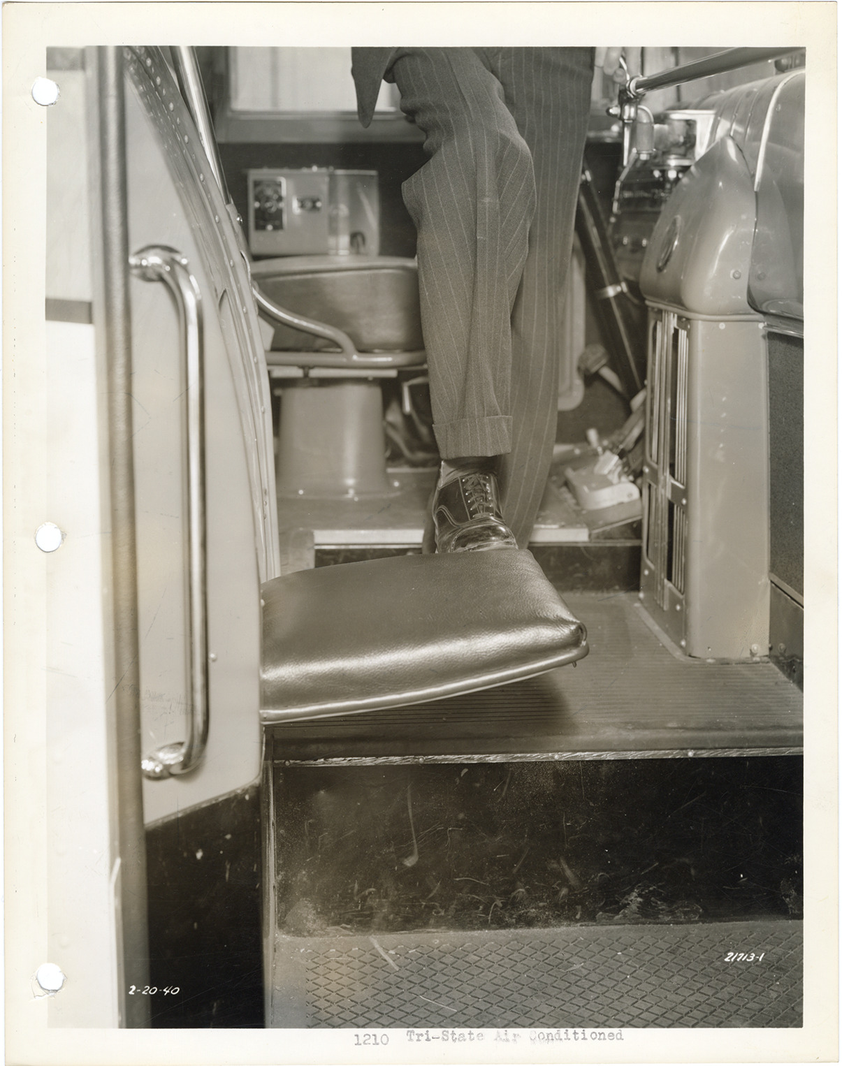 View of a man displaying a fold-out seat at the entrance of a Yellow Truck and Coach bus, Model 1210. Typed on front: "1210, Tri-State air conditioned." Printed on front: "2-20-40." Handwritten on back: "Yellow Truck & Coach. Model 1210."