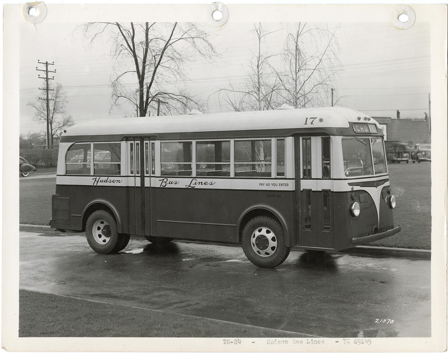 View of a Yellow Truck and Coach bus, Model 2401, for the Hudson Bus Lines. Typed on front: "TG-24, Hudson Bus Lines, YC-89145." Handwritten on back: "Yellow Truck & Coach. Model 2401."