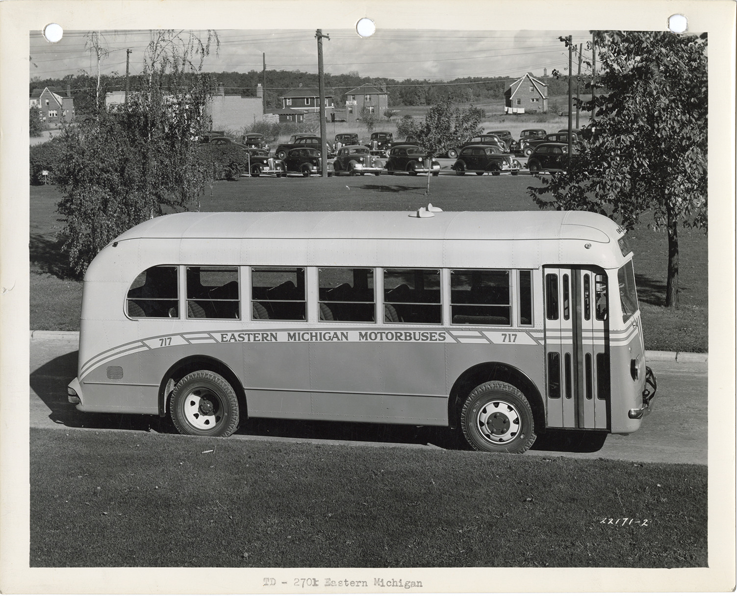 View of a Yellow Truck and Coach bus, Model 2701, for Eastern Michigan Motorbuses. Typed on front: "TD-2701, Eastern Michigan." Handwritten on back: "Yellow Truck & Coach. Model 2701."