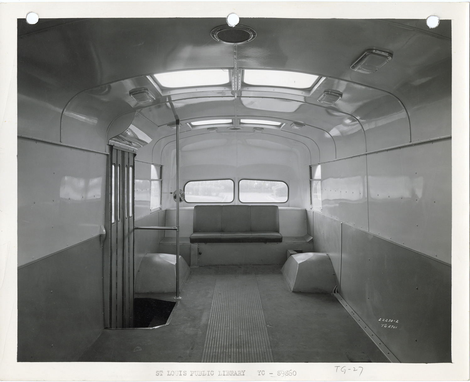 Interior view of the Hanford Crawford bookmobile branch for the St. Louis Public Library. Typed on front: "St. Louis Public Library, YC-89860." Handwritten on front: "TG-27." Handwritten on back: "Yellow Truck & Coach. Model TG-2701. St. Louis Public Library, 11-12-1940."