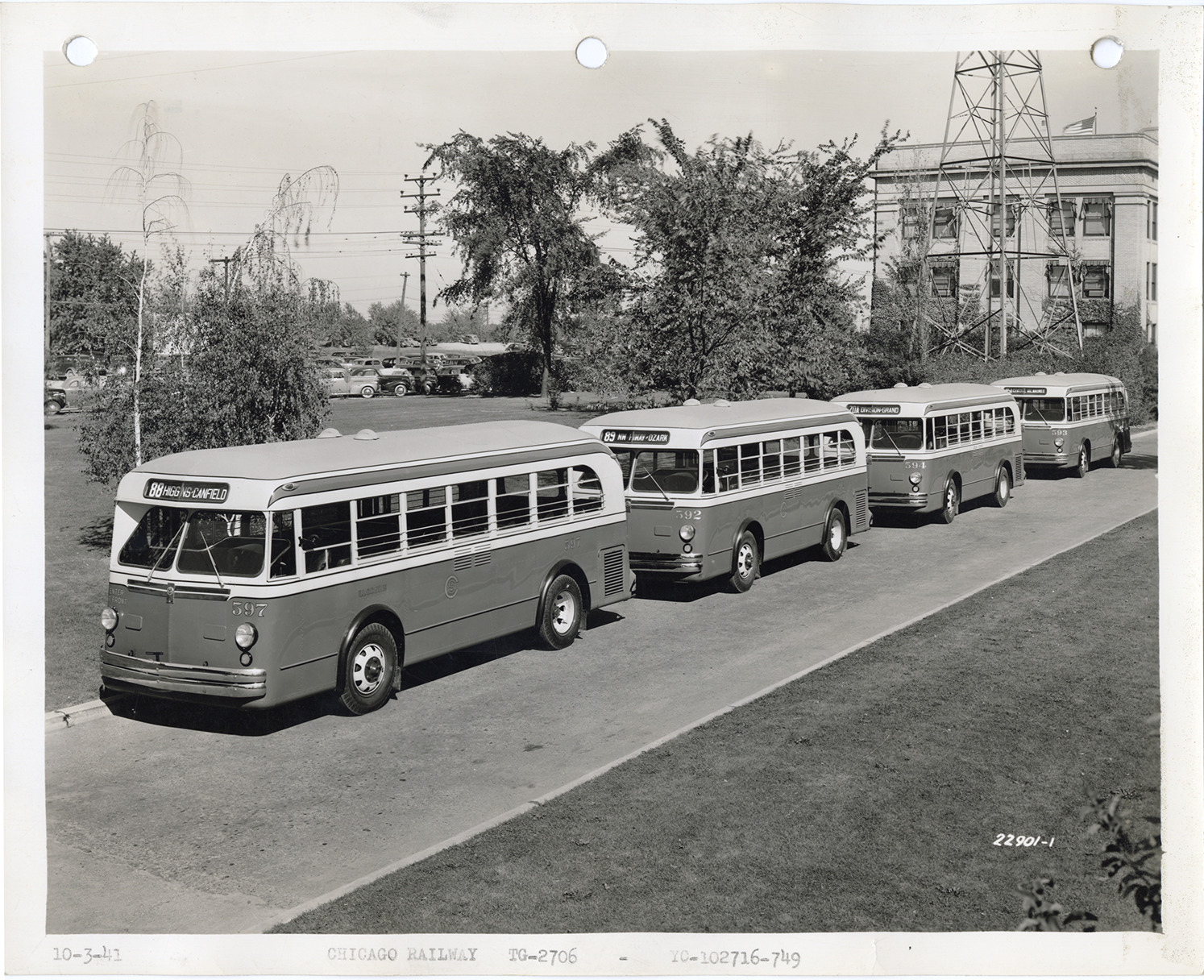 View of four Yellow Truck and Coach buses, Model 2706, for the Chicago Railway. Typed on front: "10-3-41, Chicago Railway, TG-2706, YC-102716-749." Handwritten on back: "Yellow Truck & Coach. Model 2706."