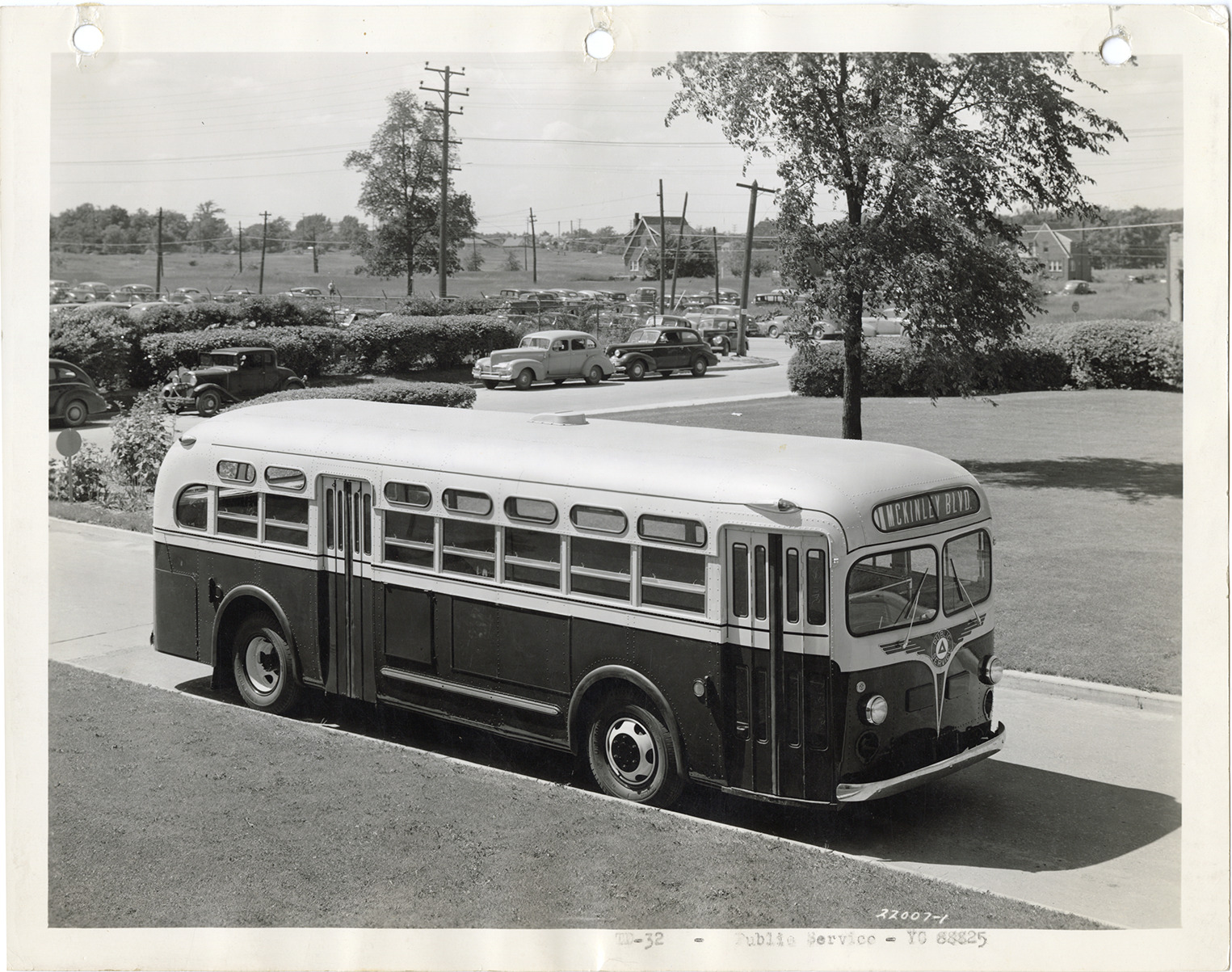 View of a Yellow Truck and Coach bus, Model TD-32. Typed on front: "TD-32, Public Service, YC-88825." Handwritten on back: "Yellow Truck & Coach. Model TD-32."