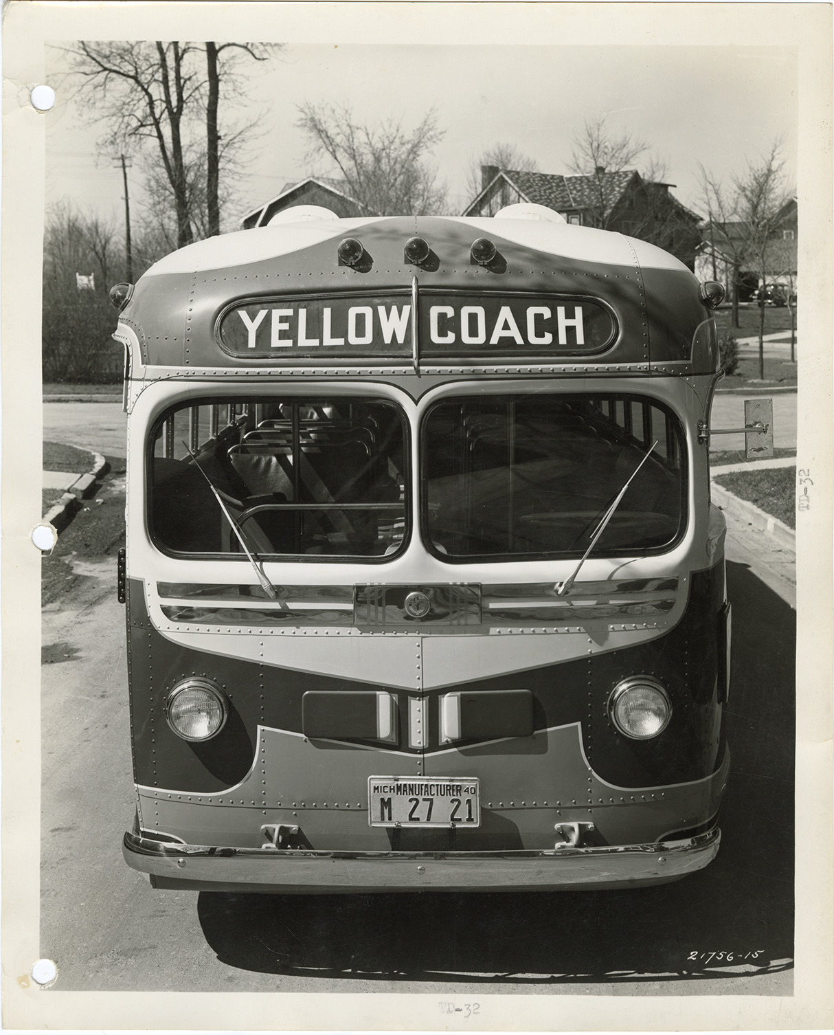 Front view of a Yellow Truck and Coach bus, Model TD-32. Typed on front: "TD-32." Handwritten on back: "Yellow Truck & Coach. Model TD-32."