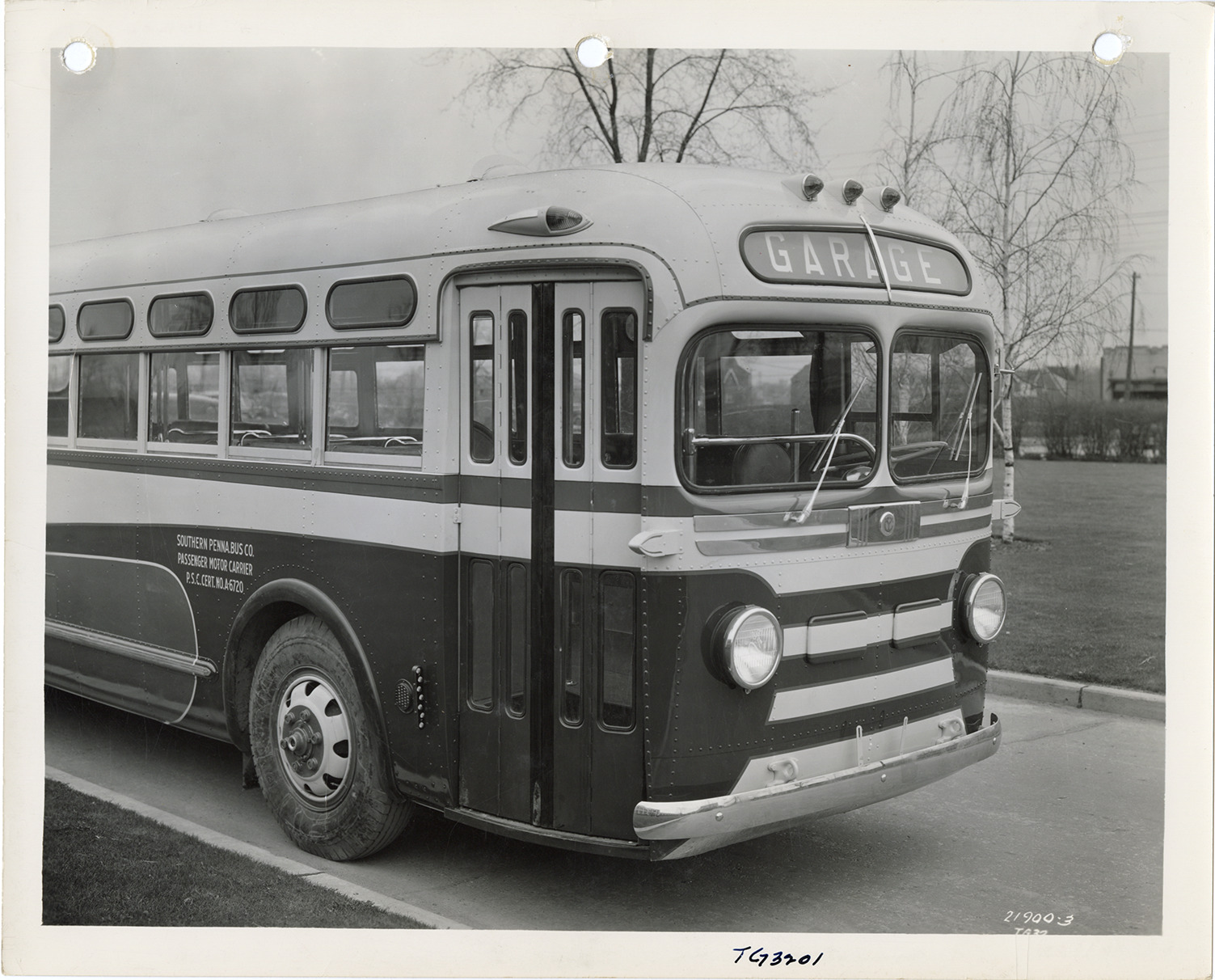 View of a Yellow Truck and Coach bus, Model TD-3201, for the Southern Pennsylvania Bus Company. Handwritten on front: "TG 3201." Handwritten on back: "Yellow Truck & Coach. Model TG-3201."