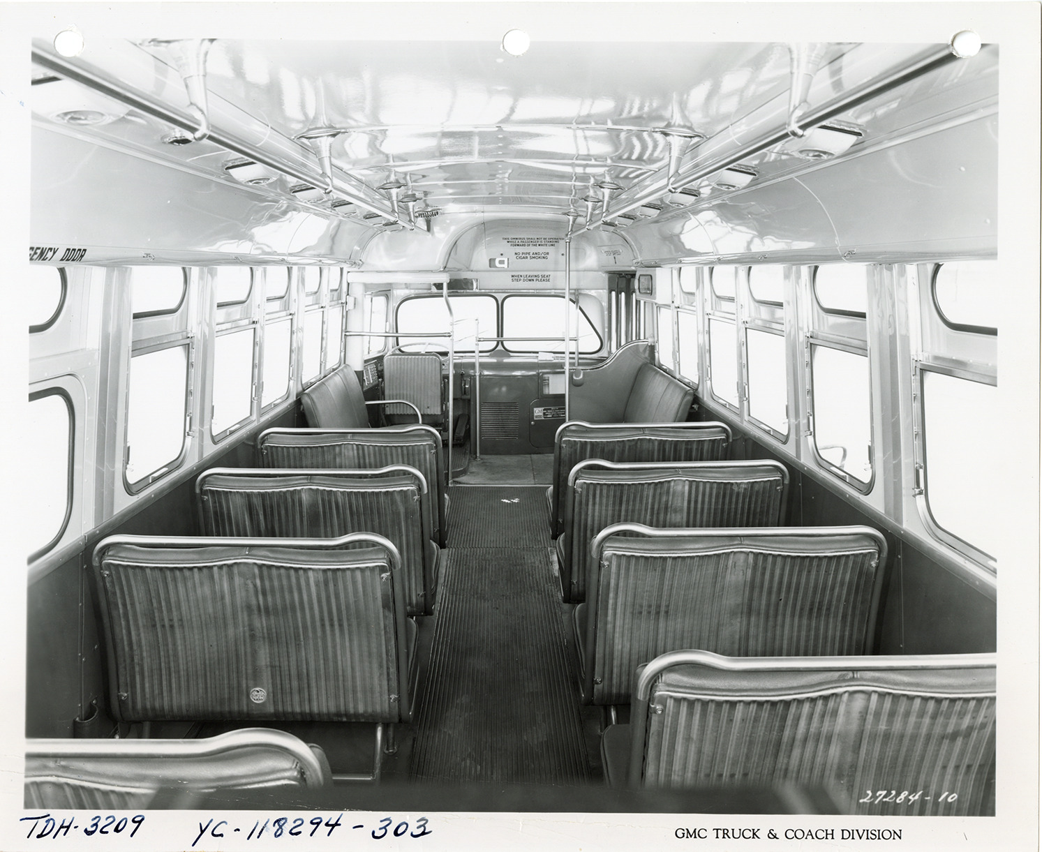 View of a Yellow Truck and Coach bus, Model TDH-3209, showing seats. Printed on front: "GMC Truck & Coach Division." Handwritten on front: "TDH-3209, YC-118294-303." Handwritten on back: "Yellow Truck & Coach. Model TDH-3209."