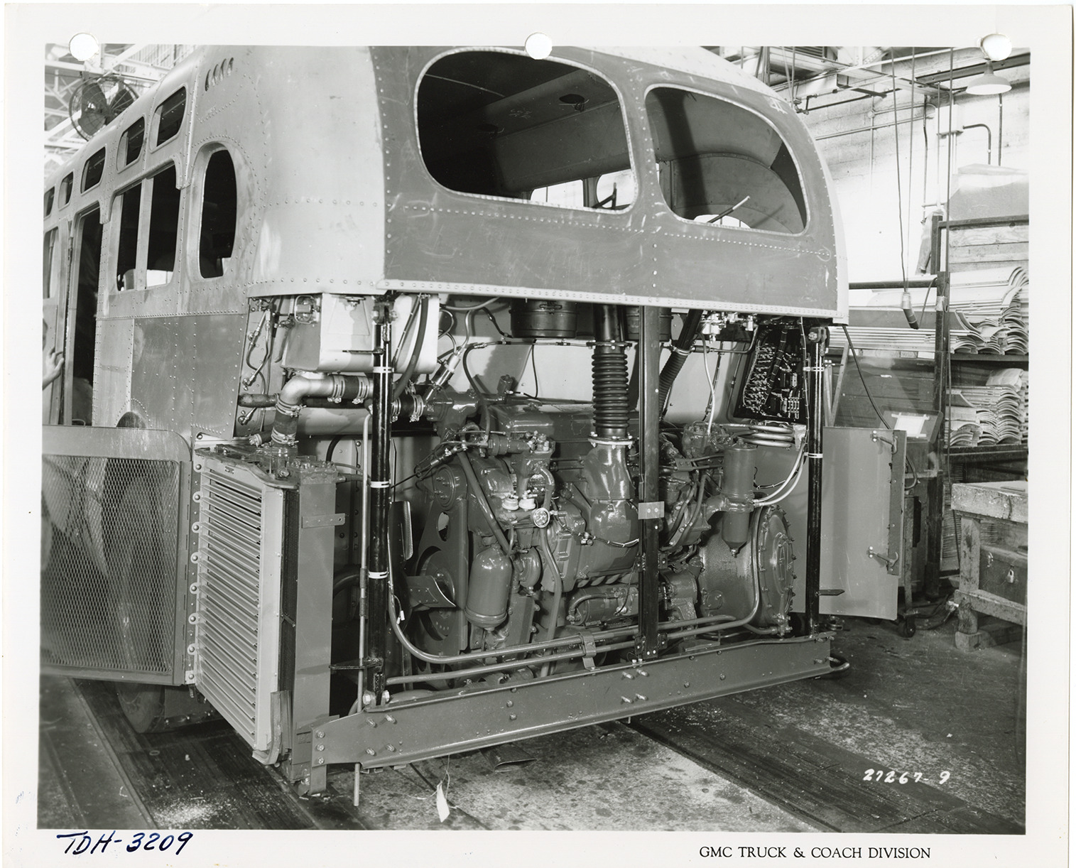 Rear view of a Yellow Truck and Coach bus, Model TDH-3209, showing engine. Printed on front: "GMC Truck & Coach Division." Handwritten on front: "TDH-3209." Handwritten on back: "Yellow Truck & Coach. Model TDH-3209."