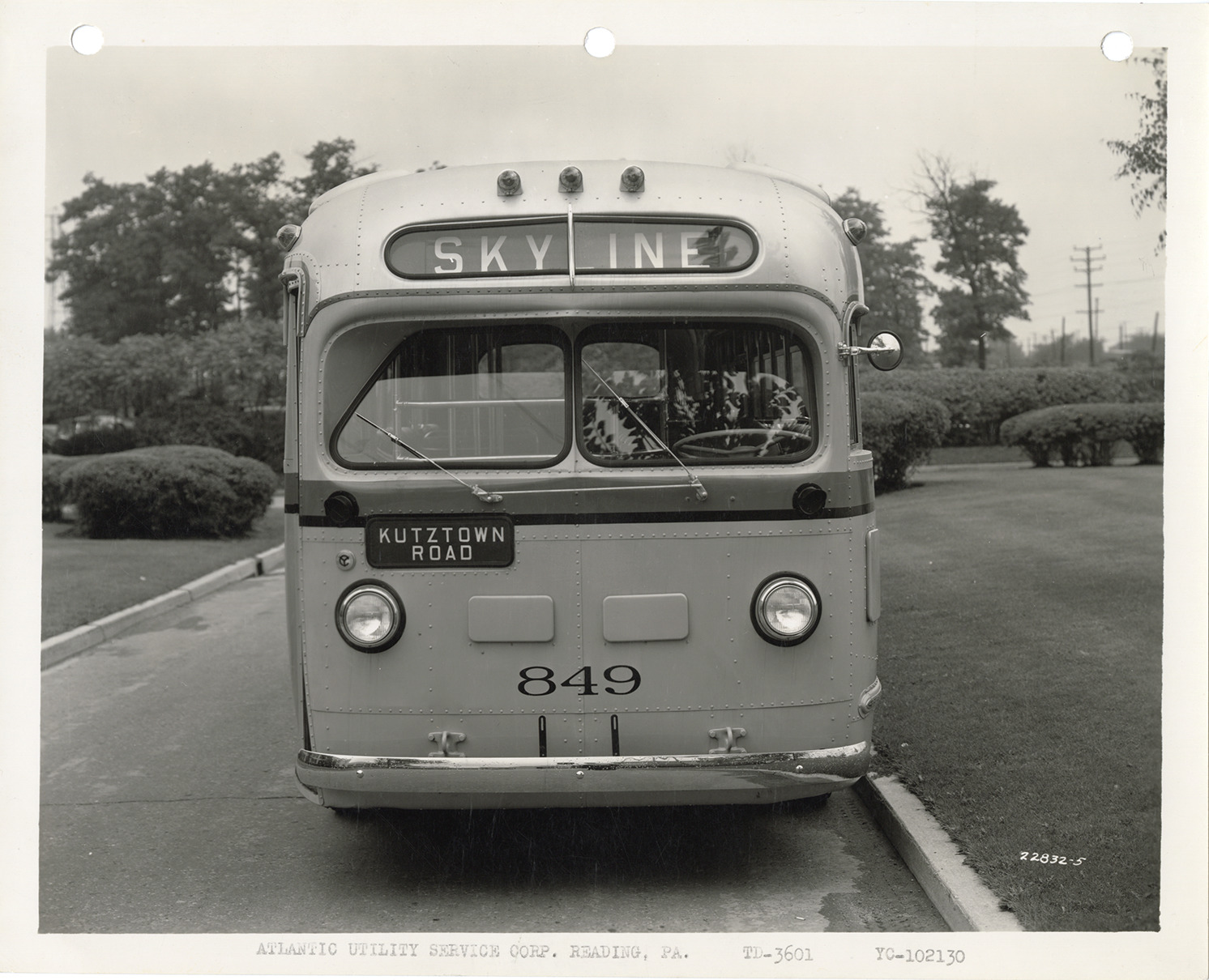 Front view of a Yellow Truck and Coach bus, Model 3601, for the Atlantic Utility Service Corp. Typed on front: "Atlantic Utility Service Corp., Reading, Pa. TD-3601, YC-102130." Handwritten on back: "Yellow Truck & Coach. Model 3601."