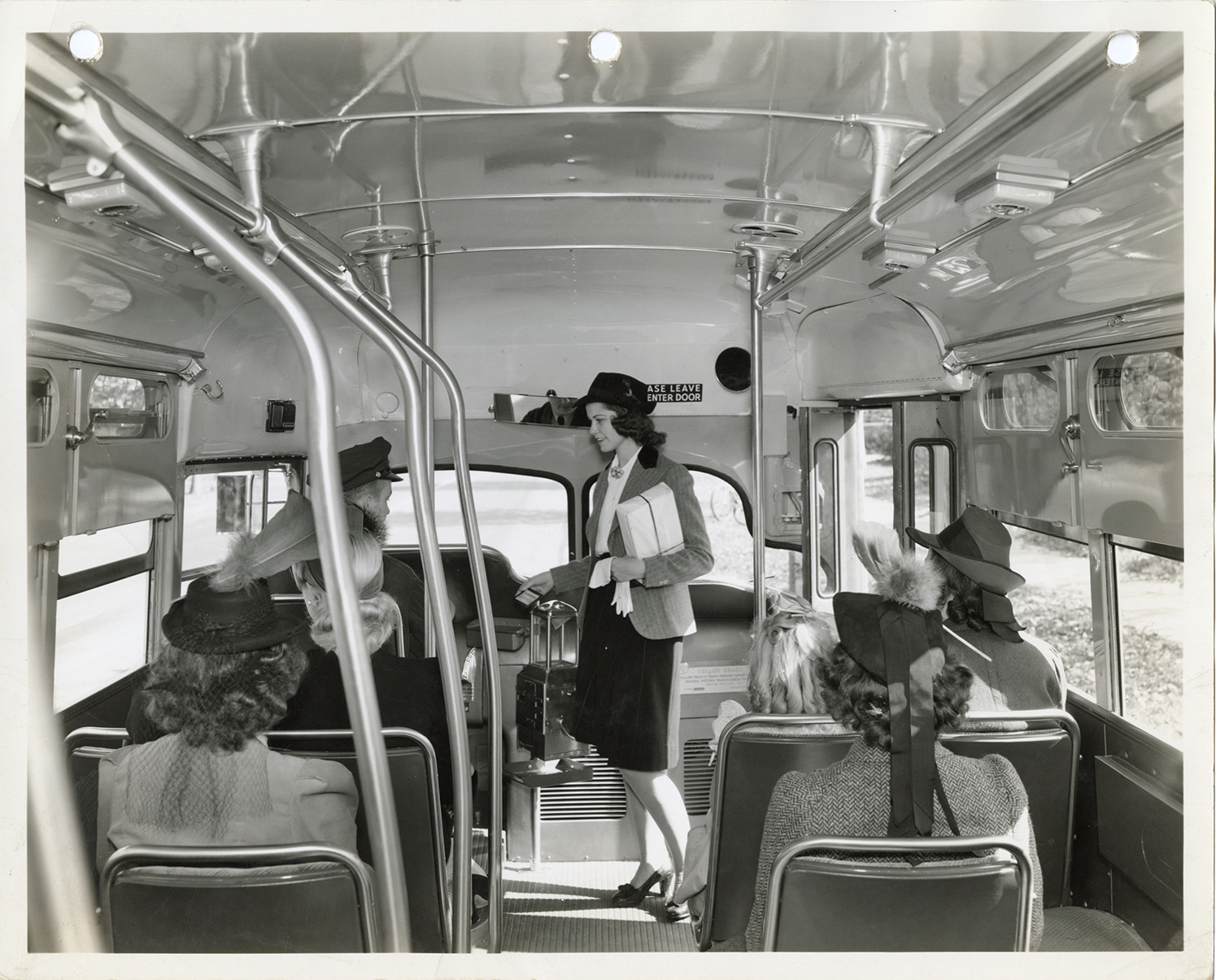 Interior view of a woman passenger boarding a Yellow Truck and Coach bus, Model TG-3603. Stamped on back: "Runder-Markham Photo Co., Inc., commercial photographers. 720 Market St., St. Louis, Mo. Chestnut 9311." Handwritten on back: "Yellow Truck & Coach. Model TG-3603, 1940."