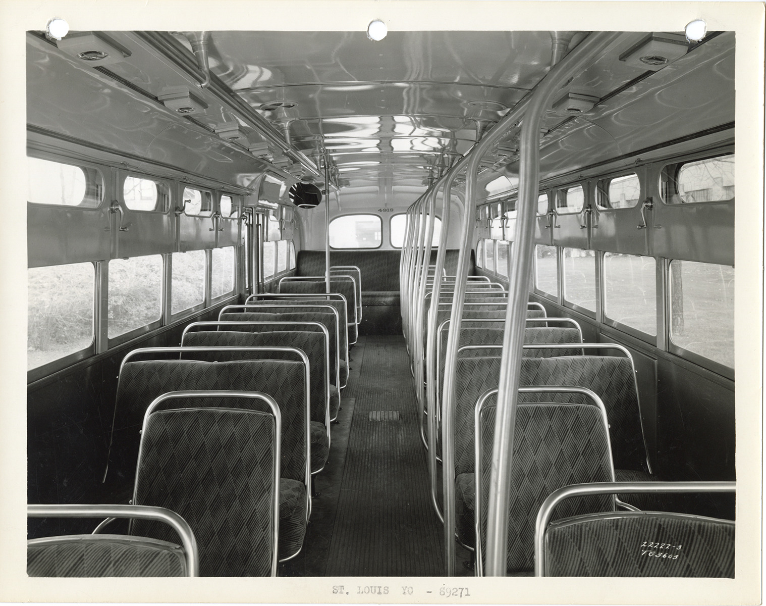 Favorite this☆ Interior, Yellow Truck and Coach bus, Model TG-3603 Description: Interior view of a Yellow Truck and Coach bus, Model TG-3603, showing seats. Typed on front: "St. Louis, YC-89271." Handwritten on back: "Yellow Truck & Coach. Model TG-3603, 1940." Details Resource ID: na049745 Subject: Buses--Interiors Buses--Seats Yellow Truck and Coach Manufacturing Company General Motors Truck Company Photographic prints Date Issued: 1940 Format: 1 photographic print ; 8 x 10 in. Member of: National Automotive History Collection Filing Location: MS121/VanDegrift, Thomas, 20:10 Rights: Physical rights are retained by DPL. Copyright is retained in accordance with U.S. copyright laws.