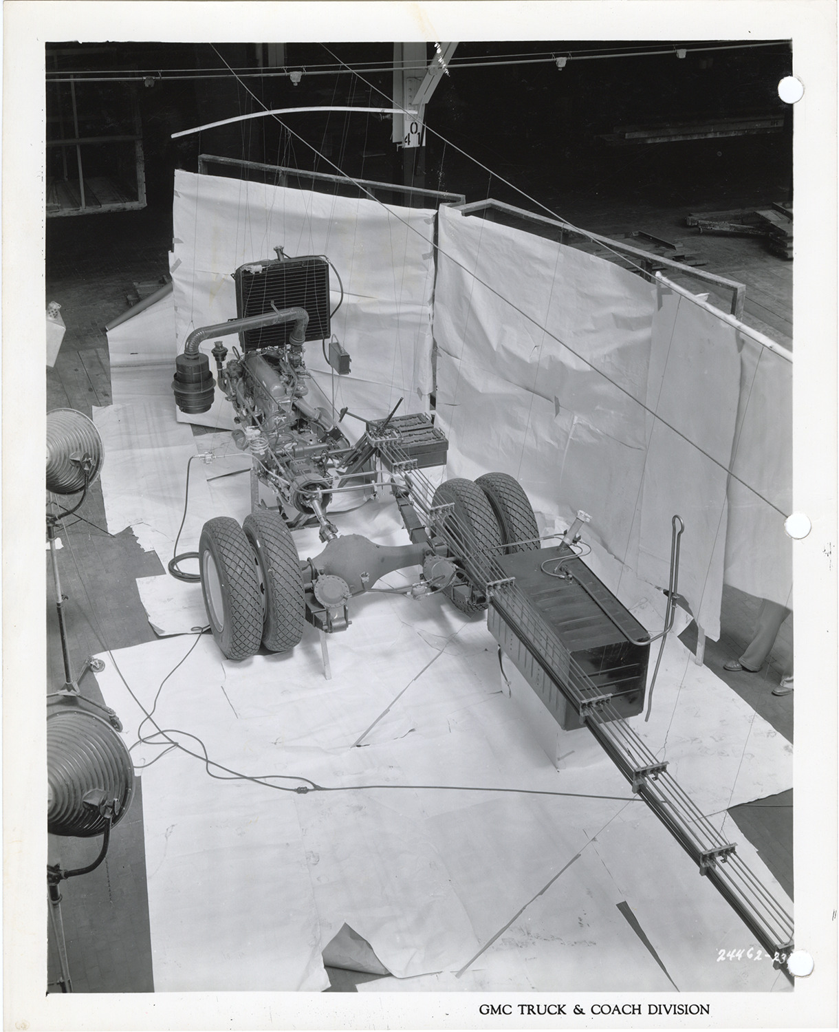 View of the chassis of a Yellow Truck and Coach bus, Model PGA-3702. Printed on front: "GMC Truck & Coach Division." Stamped on back: "Nov 1, 1944." Handwritten on back: "Yellow Truck & Coach. Model PGA-3702."
