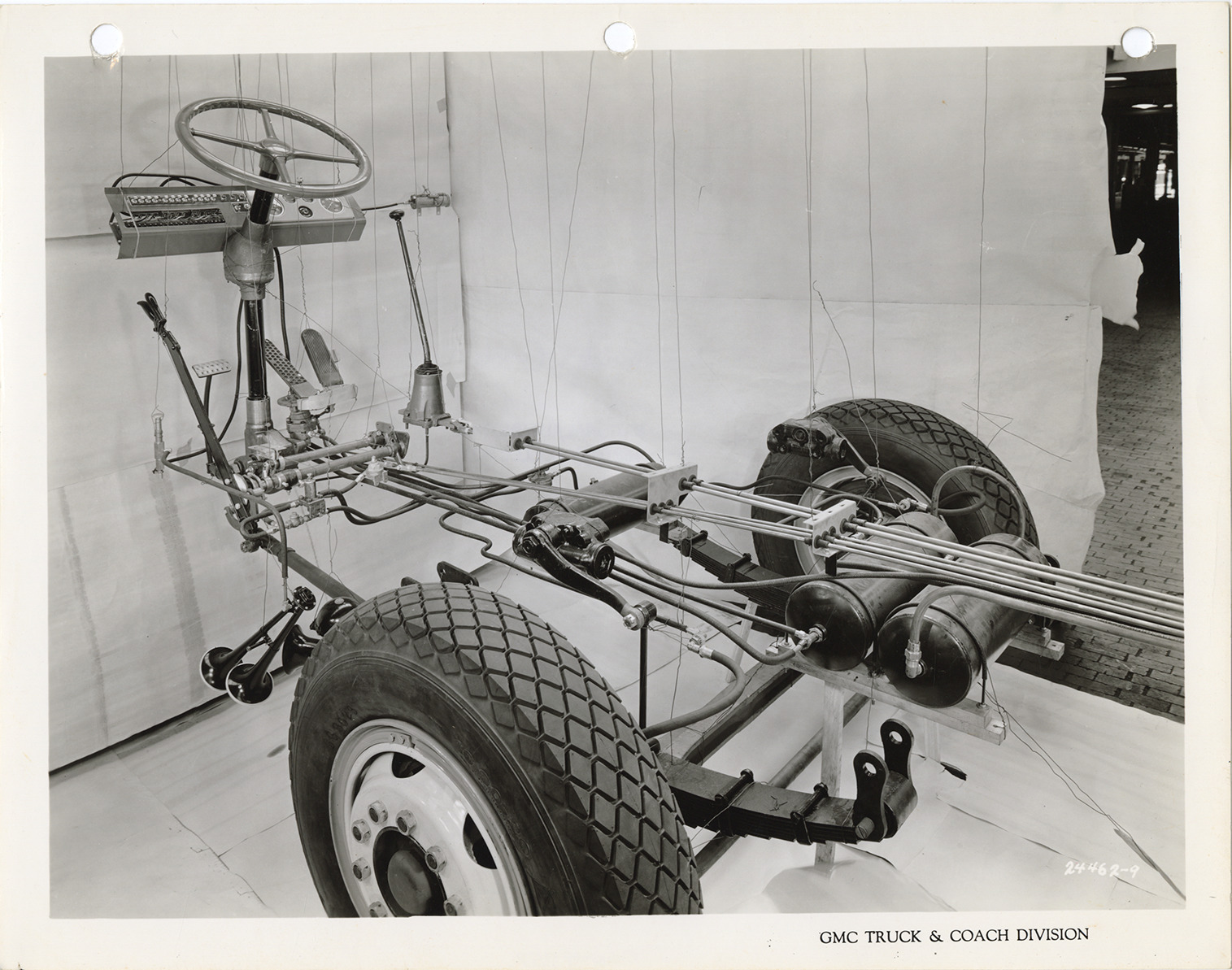 View of the chassis of a Yellow Truck and Coach bus, Model PGA-3702. Printed on front: "GMC Truck & Coach Division." Stamped on back: "Nov 1, 1944." Handwritten on back: "Yellow Truck & Coach. Model PGA-3702."