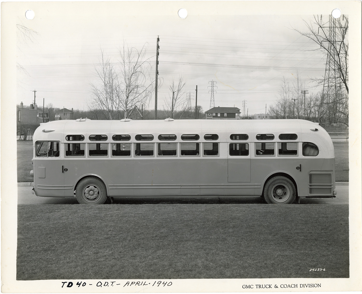 View of a Yellow Truck and Coach bus, Model TDH-40. Printed on front: "GMC Truck & Coach Division." Handwritten on front: "TD-40, ODT, April, 1940." Handwritten on back: "Yellow Truck & Coach. Model TDH-40. 1944 delivery."