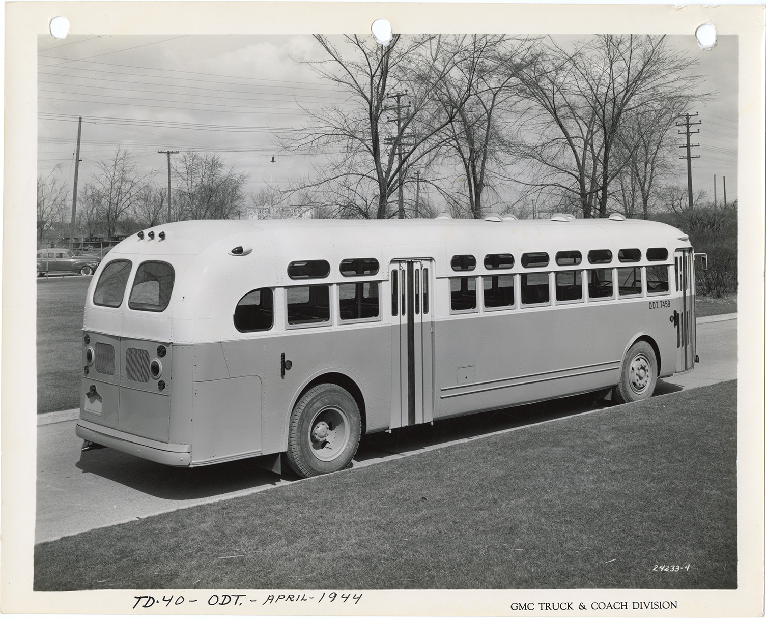 View of a Yellow Truck and Coach bus, Model TDH-40. Printed on front: "GMC Truck & Coach Division." Handwritten on front: "TD-40, ODT, April, 1944." Handwritten on back: "Yellow Truck & Coach. Model TDH-40. 1944 delivery."