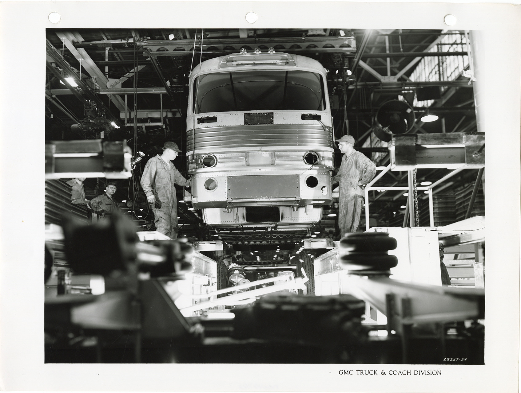View of factory workers assembling a GMC Truck & Coach bus, Model PD-4104. Printed on front: "GMC Truck & Coach Division." Handwritten on back: "GMC Truck & Coach. Model PD-4104."