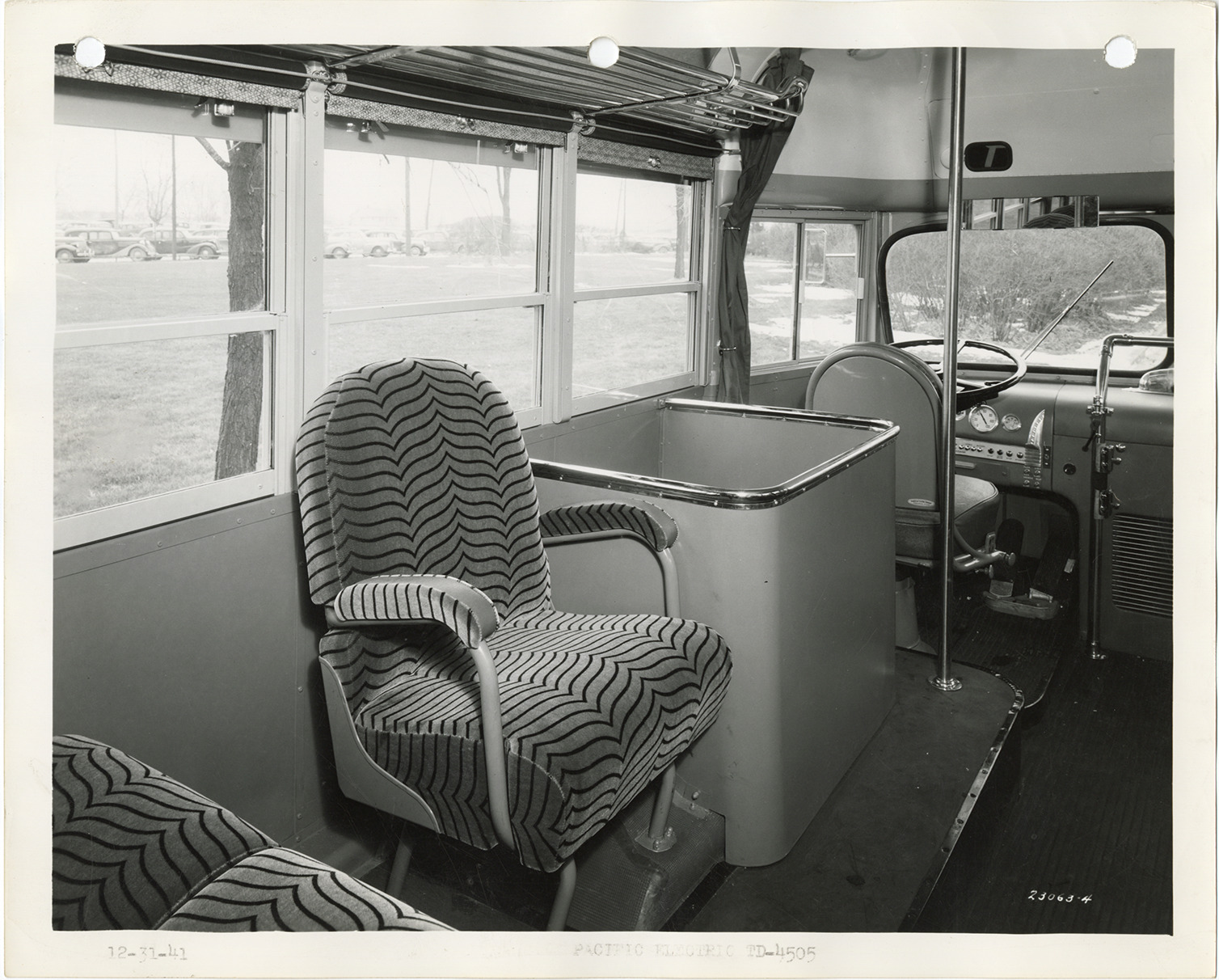 Interior view of a Yellow Truck and Coach bus, Model TD-4505, for the Pacific Electric Railway Company, showing seats. Typed on front: "12-31-41, Pacific Electric, TD-4505." Handwritten on back: "Yellow Truck & Coach, Model 4505."