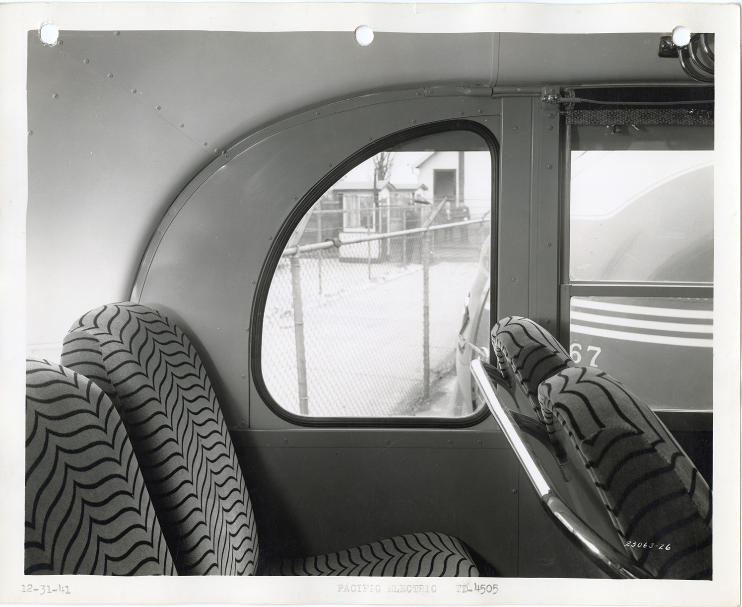 Interior view of a Yellow Truck and Coach bus, Model TD-4505, for the Pacific Electric Railway Company, showing seats and window. Typed on front: "12-31-41, Pacific Electric, TD-4505." Handwritten on back: "Yellow Truck & Coach, Model 4505. Ref: 22995 series."