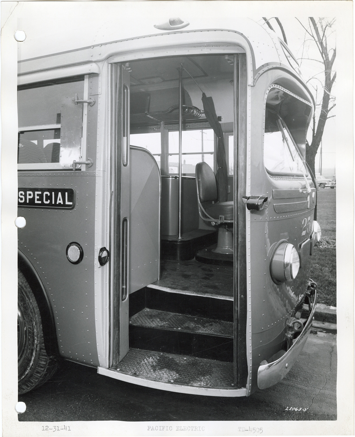 Interior view of a Yellow Truck and Coach bus, Model TD-4505, for the Pacific Electric Railway Company, showing driver's seat. Typed on front: "12-31-41, TD-4505, Pacific Electric." Handwritten on back: "Yellow Truck & Coach, Model 4505."