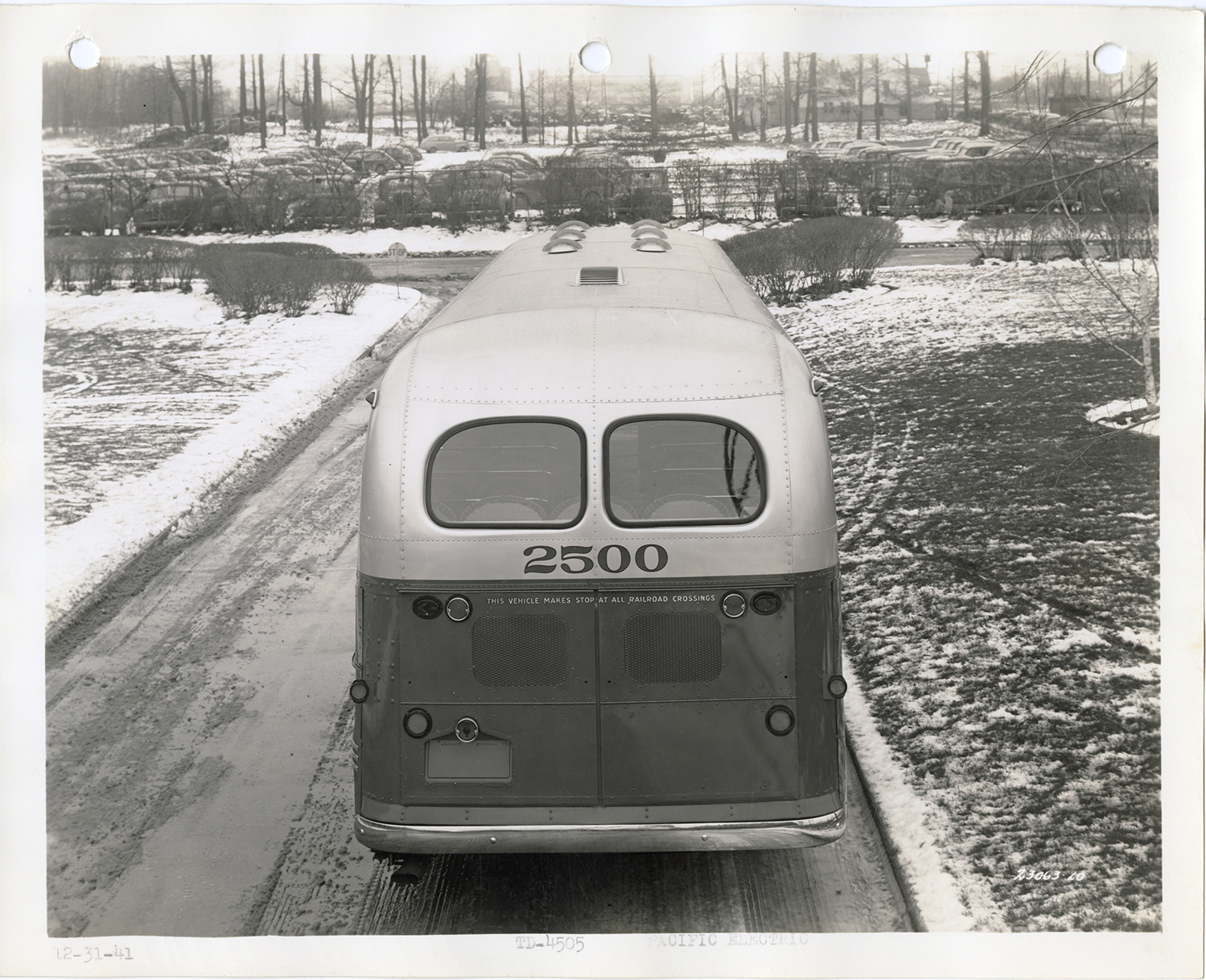 Rear view of a Yellow Truck and Coach bus, Model TD-4505, for the Pacific Electric Railway Company. Typed on front: "12-31-41, TD-4505, Pacific Electric." Handwritten on back: "Yellow Truck & Coach, Model 4505."