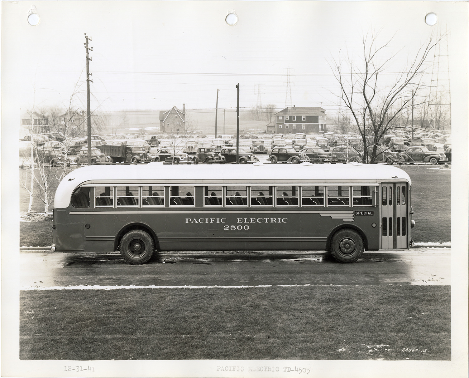 View of a Yellow Truck and Coach bus, Model TD-4505, for the Pacific Electric Railway Company. Typed on front: "12-31-41, Pacific Electric, TD-4505." Handwritten on back: "Yellow Truck & Coach, Model 4505."