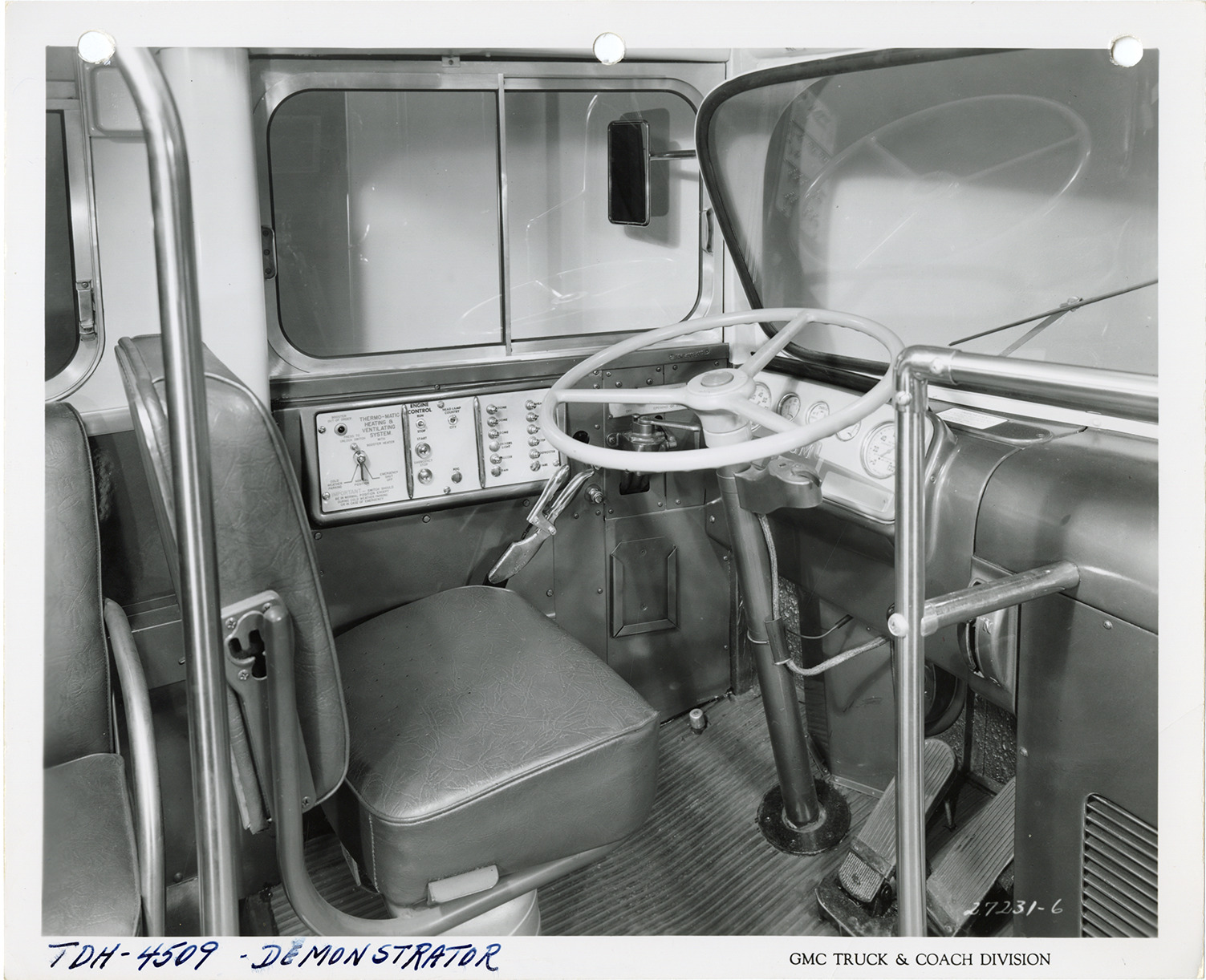 Interior view of a GMC Truck & Coach bus, Model TDH-4509, showing driver's seat and steering wheel. Printed on front: "GMC Truck & Coach Division." Handwritten on front: "TDH-4509, demonstrator." Handwritten on back: "GMC Truck & Coach, Model TDH-4509."