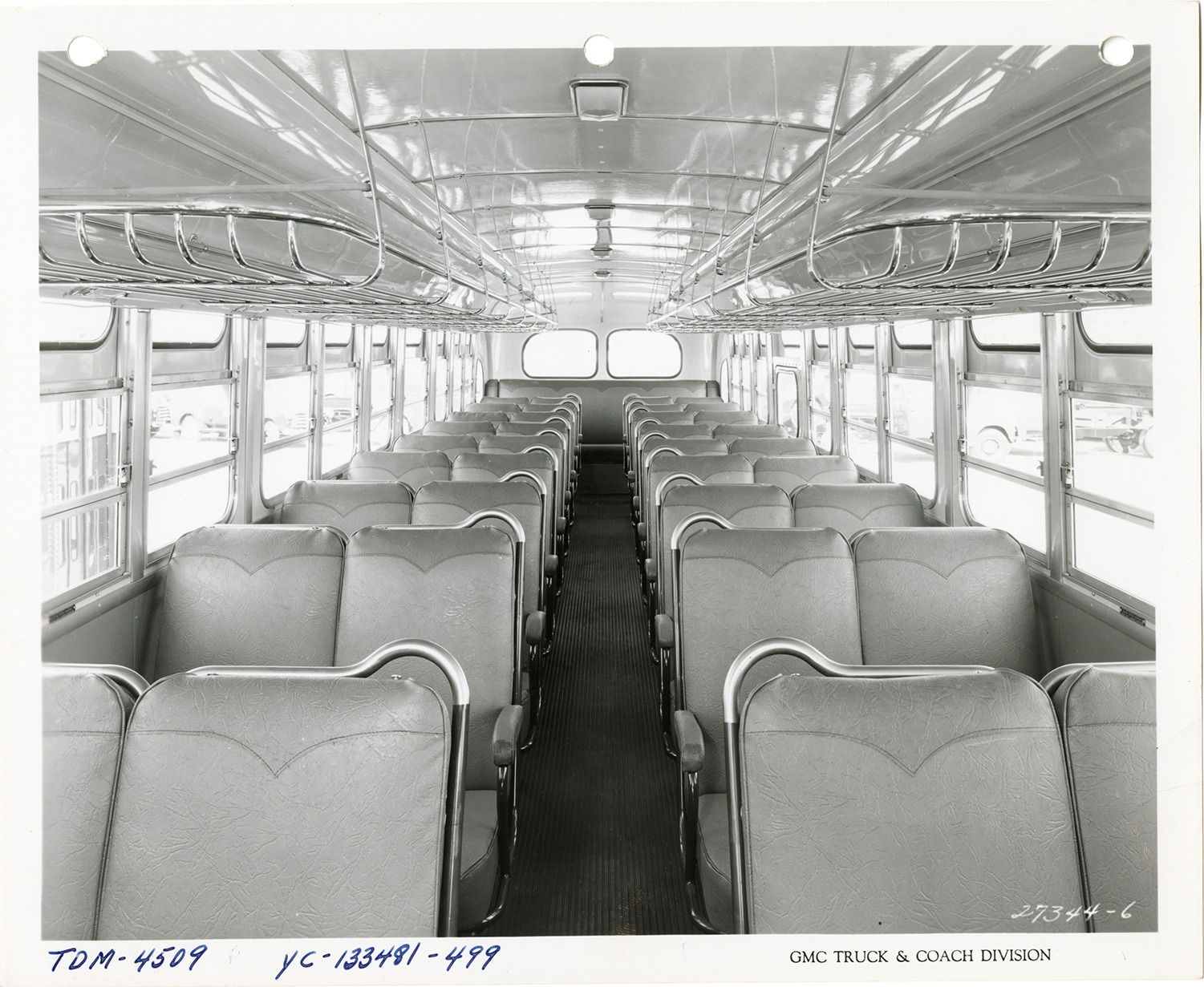 Favorite this☆ Interior, GMC Truck & Coach bus, Model TDM-4509 Description: Interior view of a GMC Truck & Coach bus, Model TDM-4509, showing seats. Printed on front: "GMC Truck & Coach Division." Handwritten on front: "TDM-4509, YC-133481-499." Handwritten on back: "GMC Truck & Coach, Model TDM-4509. Public Service, 6-49." Details Resource ID: na049829 Subject: Buses--Interiors Buses--Seats GMC Truck & Coach Photographic prints Date Issued: 1949-06 Format: 1 photographic print ; 8 x 10 in. Member of: National Automotive History Collection Filing Location: MS121/VanDegrift, Thomas, 21:11 Rights: Physical rights are retained by DPL. Copyright is retained in accordance with U.S. copyright laws.