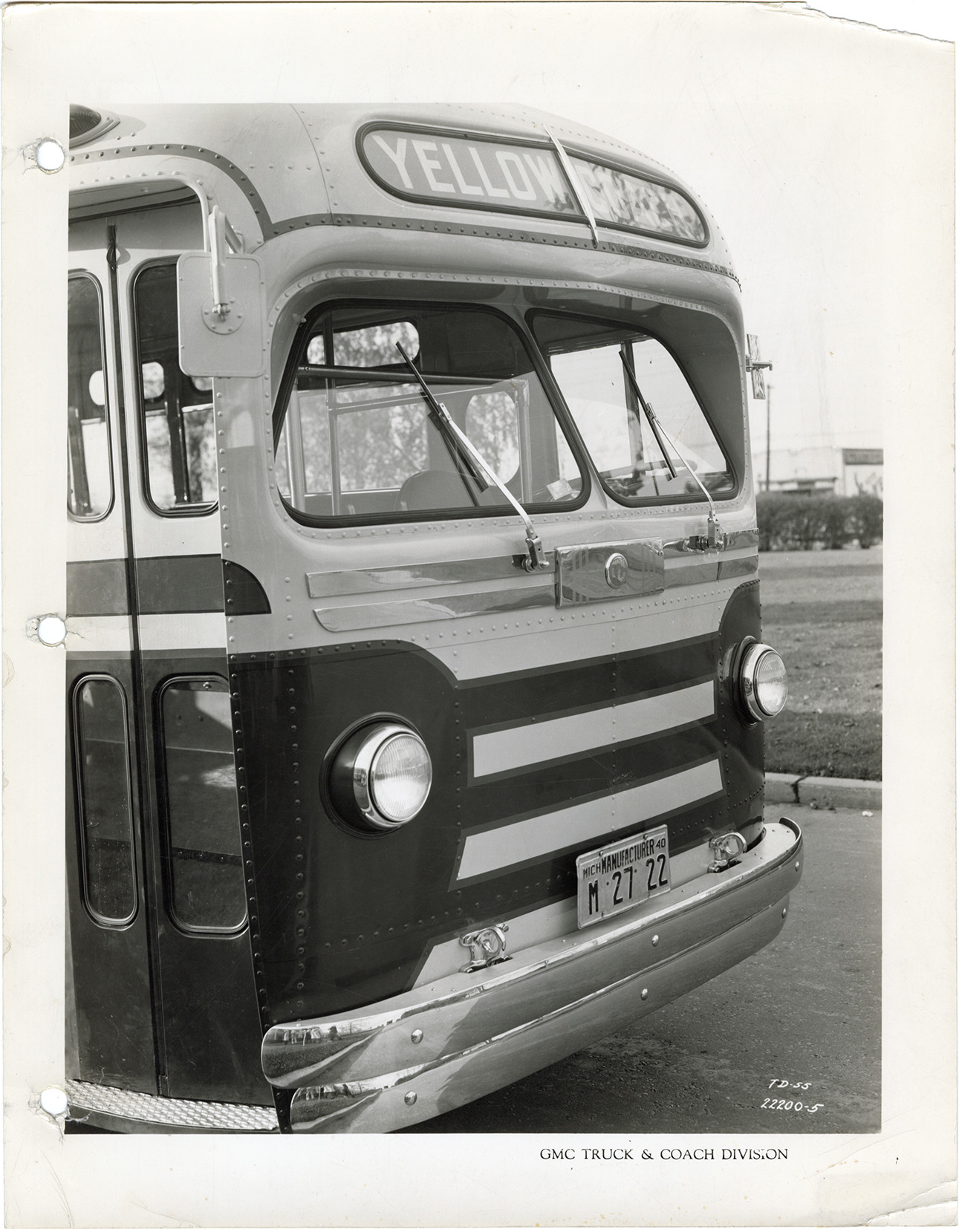 Favorite this☆ Yellow Truck and Coach bus, Model TD-55 Description: Partial view of front end of a Yellow Truck and Coach bus, Model TD-55. Printed on front: "GMC Truck & Coach Division." Handwritten on back: "Yellow Truck & Coach, Model TD-55." Details Resource ID: na049838 Subject: Buses Yellow Truck and Coach Manufacturing Company General Motors Truck Company Photographic prints Date Issued: 1940 Format: 1 photographic print ; 11 x 8.5 in. Member of: National Automotive History Collection Filing Location: MS121/VanDegrift, Thomas, 21:12 Rights: Physical rights are retained by DPL. Copyright is retained in accordance with U.S. copyright laws.